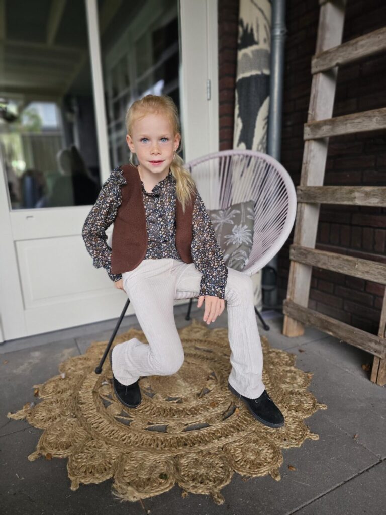 De blouse is van een tikkeltje transparant stof. Er zitten leuke ruffeltjes op de kraag en op de schouders verwerkt. De print van bloemetjes geeft de blouse een warme herfstige uitstraling. Perfect voor onder het gilet want de blouse zelf is voor de winter vrij dunnetjes.