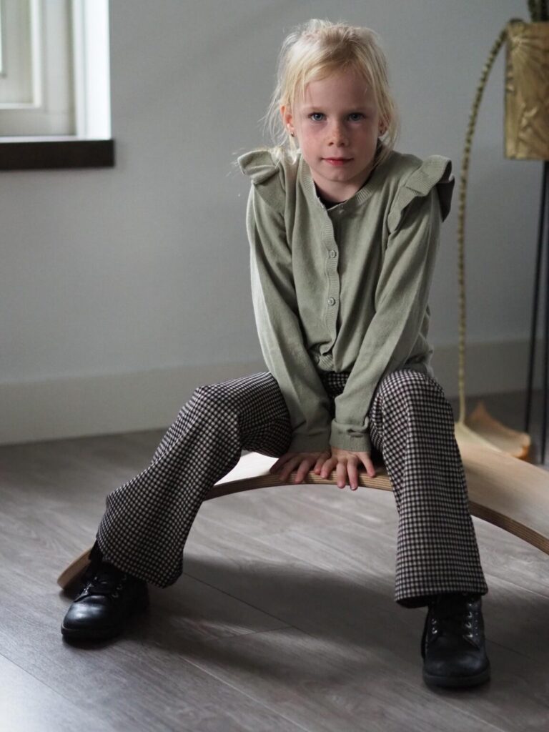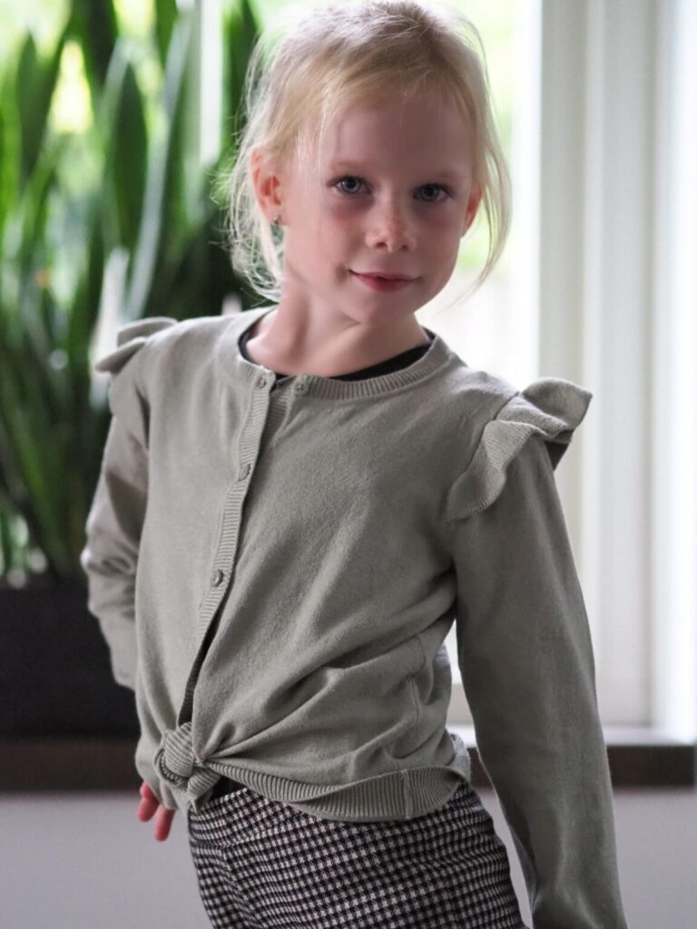 Vandaag laten we jullie een outfit van de Hema zien. Nu hebben ze daar 30% korting op alle baby en kinderkleding. Dat is natuurlijk altijd lekker shoppen. Vie draagt een flared broekje met ruitjes print en een heel subtiel glimmerdraadje erdoorheen. Op de broek draagt ze een mooi lichtgroen vestje met ruffelmouwtjes. Deze dragen we dicht met een speelse knoop onderin. Je kunt het vestje ook gemakkelijk open dragen met een basic zwart shirtje eronder.