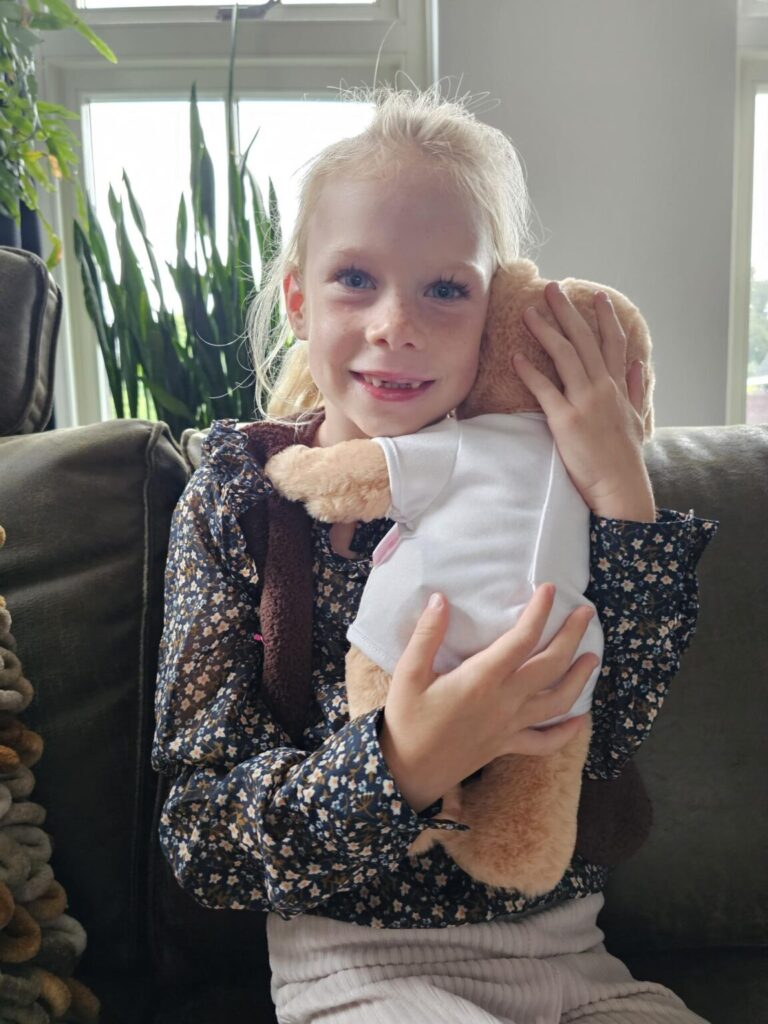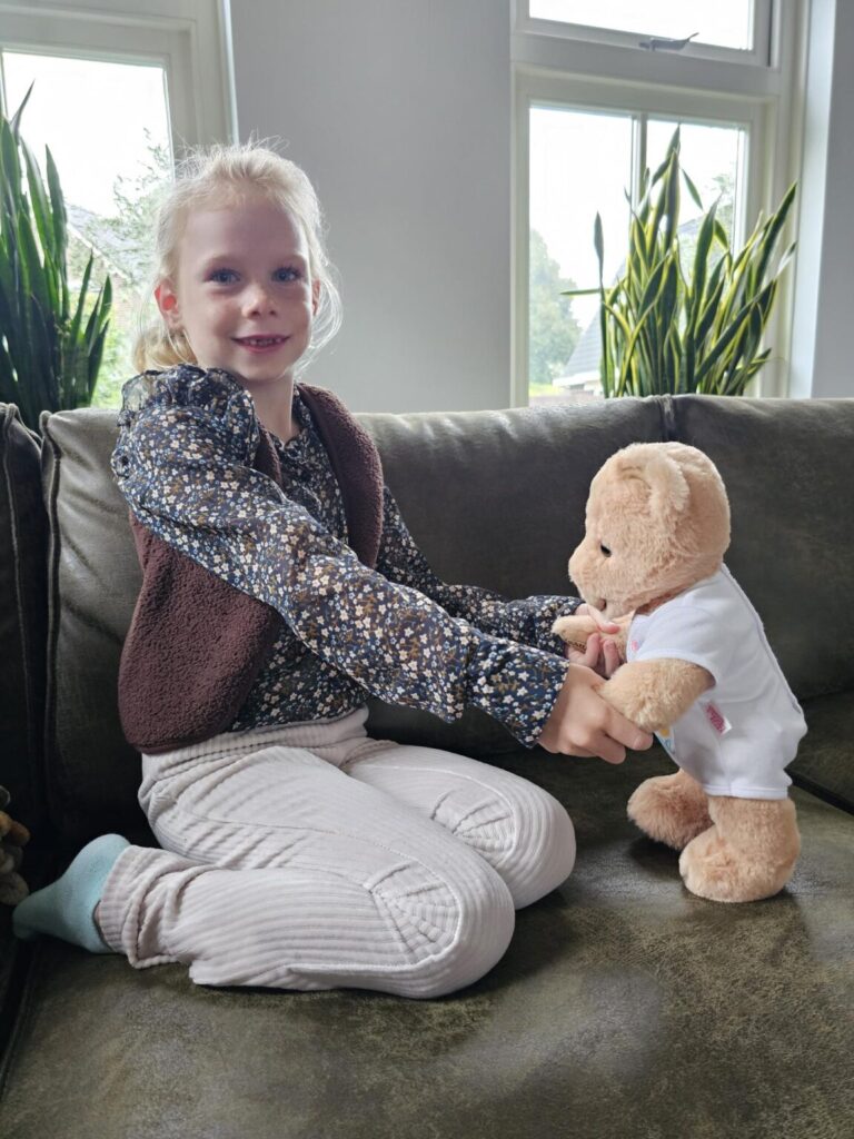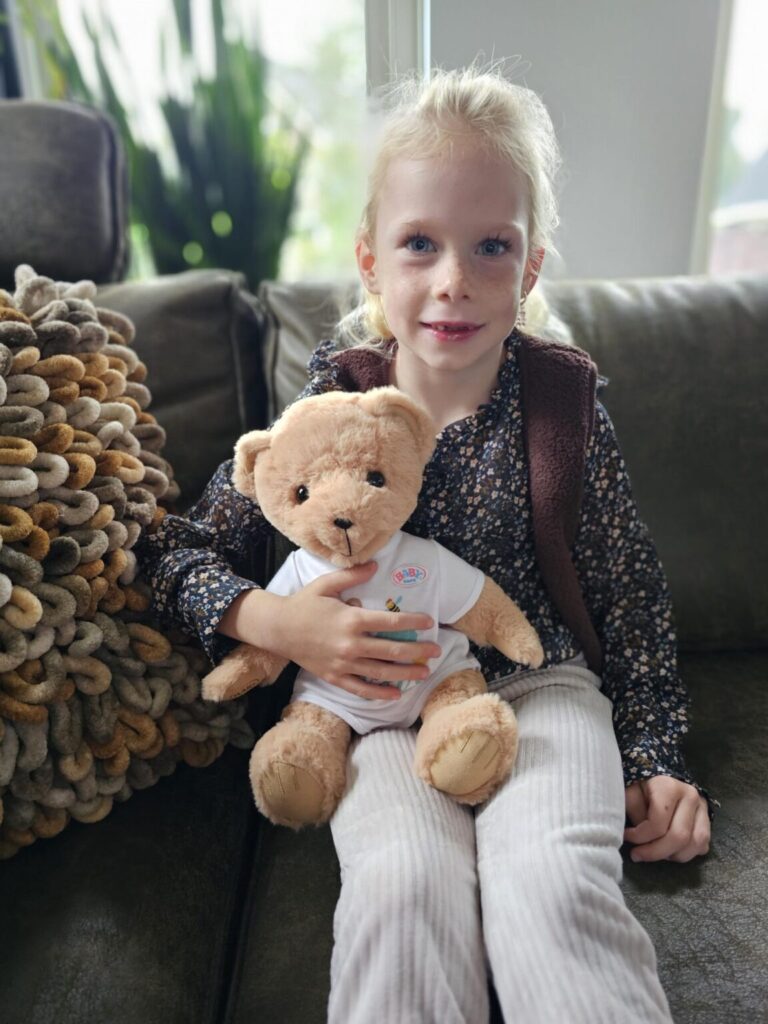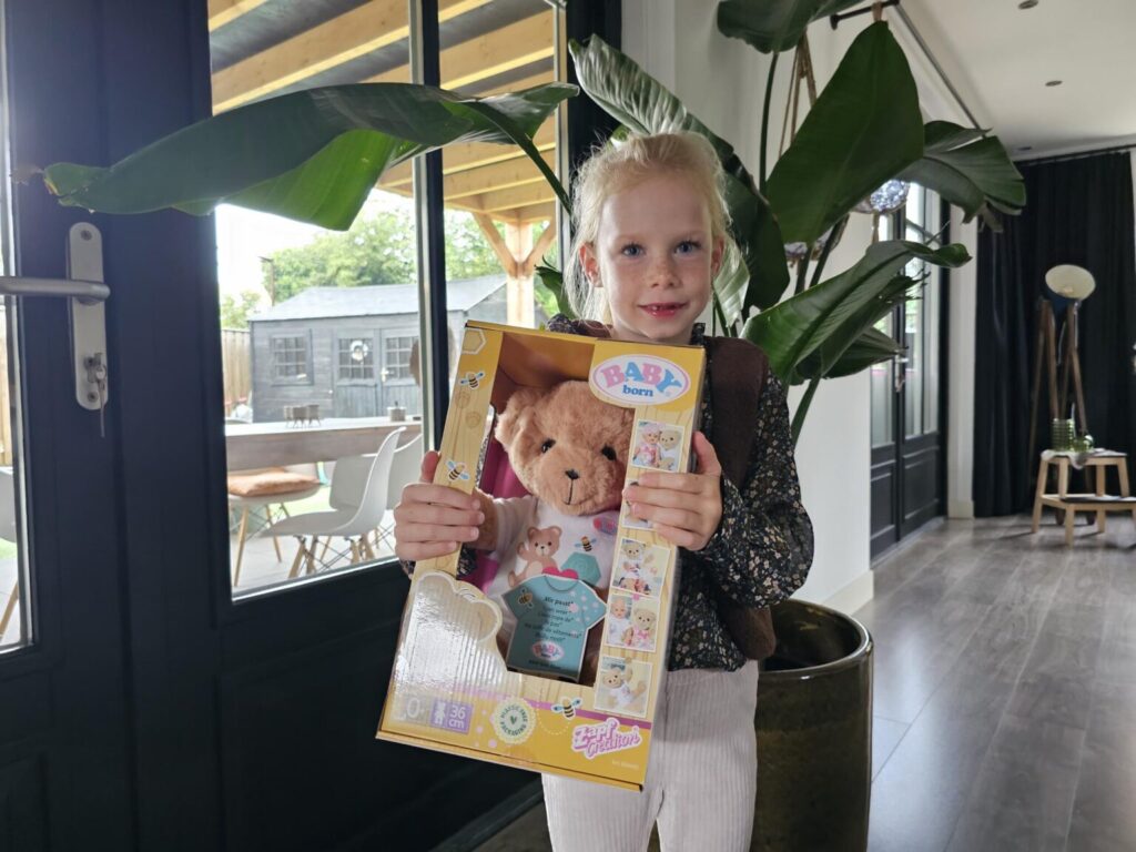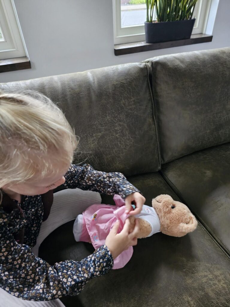 Bij het zien van deze baby born beer werd hier een meisje razend enthousiast. Als er iemand hier dol is op poppen en knuffels dan is het onze Vie wel. Af en aan sjouwt ze rond met haar ‘baby’s’ en deze beste vriend voor BABY born was de kers op de taart. Meteen ging ze in de weer met de schoentjes en het jurkje en ook het boekje moest direct bestickerd worden. De rest van de dag had ze geen oog meer voor andere dingen.