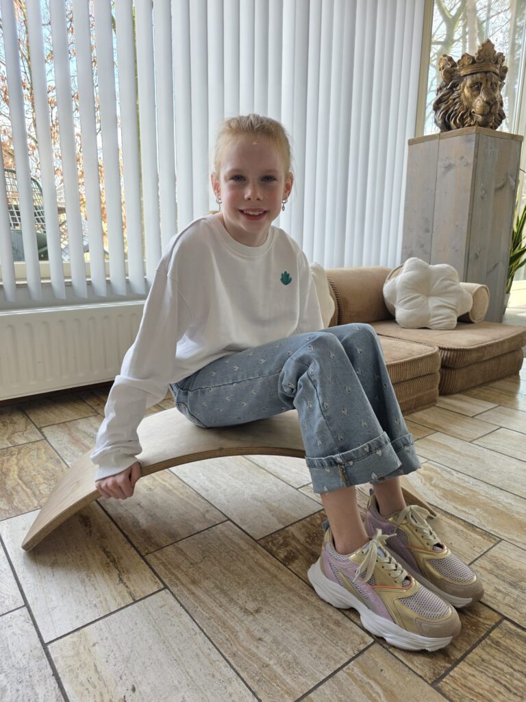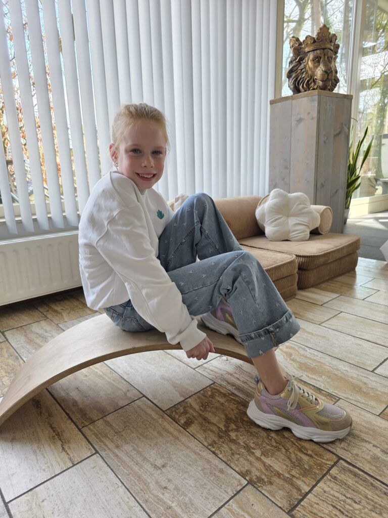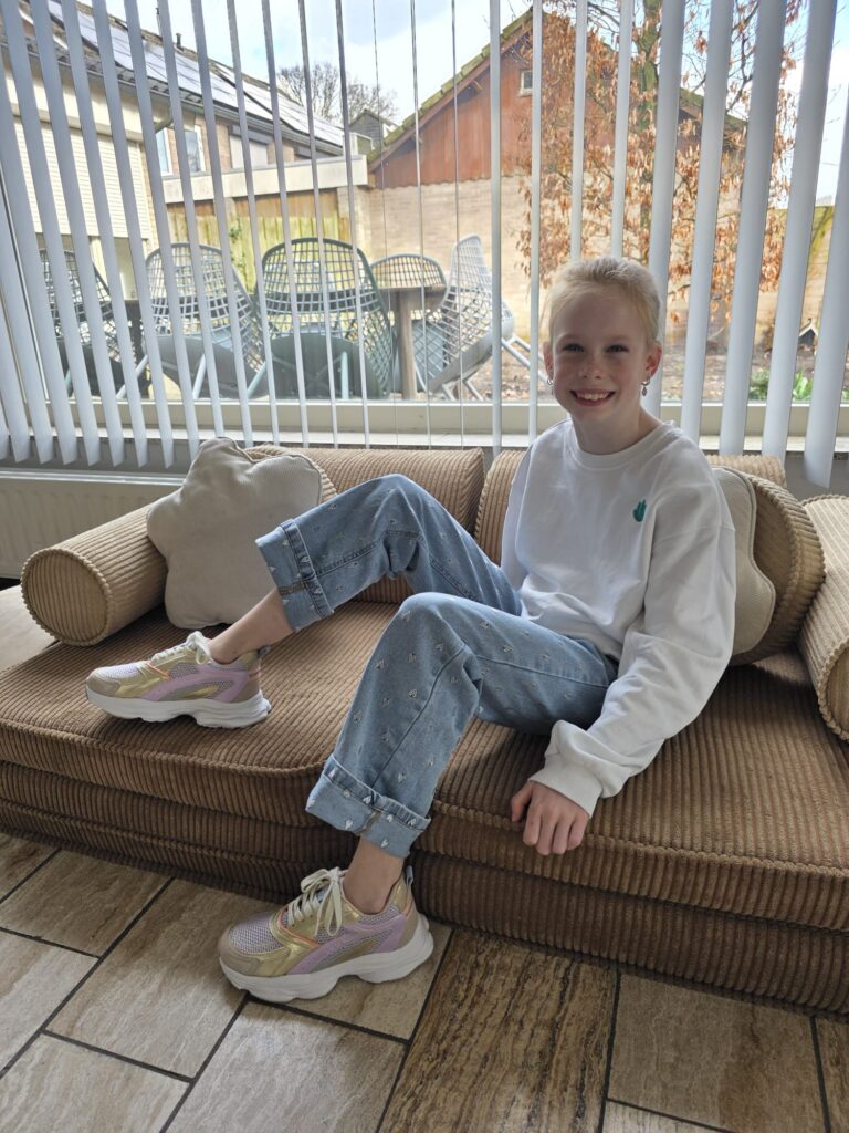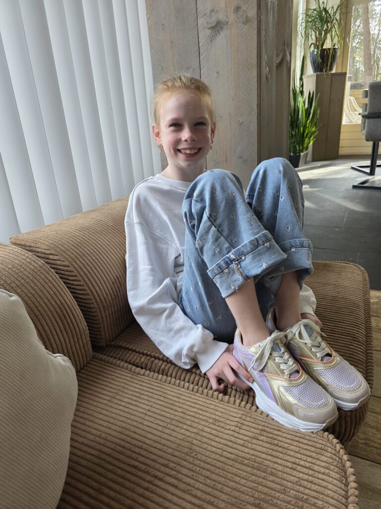 Eerst begonnen we met het opmeten van de voeten van Vie, inmiddels komt ze al op schoenmaat 35 uit en laten ze bij Shoesme voor die maat nou net hele toffe nieuwe sneakers in de collectie hebben. We waren beide direct verliefd op deze metallic gouden sneaker met lila accenten. Echt een stoere meiden schoen. Deze sneaker heeft een uitneembaar voetbed en een EVA-zool met rubberen profiel welke zorgt voor een fijne veerkracht bij elke stap. Deze trendy en sportieve sneaker maakt je outfit helemaal af en is in diverse kleuren verkrijgbaar. Helemaal top voor ons actieve meisje, maar ook voor jongens vind je bij Shoesme stoere sneakers.