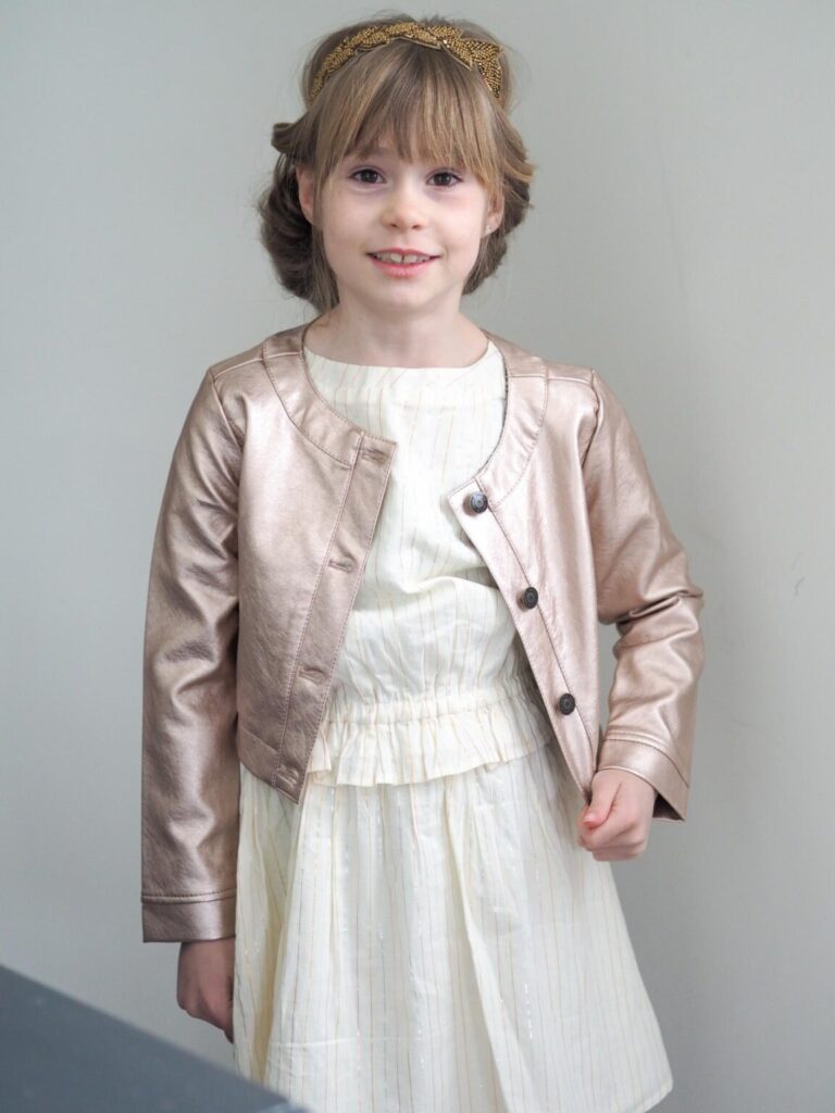 De kleding die we voor deze dag kiezen kunnen we naderhand wél weer gewoon aan maar dan op een andere manier gestyled. Jez draagt bijvoorbeeld een witte jurk met subtiele streepjes van zilver, goud en koper van Le Big met daarover een rosé gouden jasje van Like Flo. Een echte outfit voor een feestje. Ze zal de jurk in de zomer zonder jasje dragen en het jasje juist weer combineren bij een stoere jeans of short.