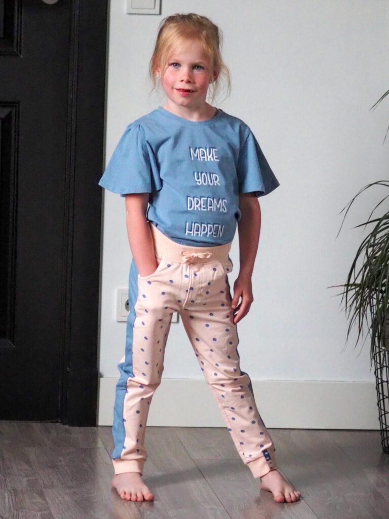 Als laatste laat Vie nog een mooie pastel kleurige set zien. Het licht blauwe shirt heeft leuke vlindermouwen en een applicatie op de voorkant. Hij combineert super leuk op het peach kleurig broekje met licht blauwe stipjes en een bies op de zijkant.