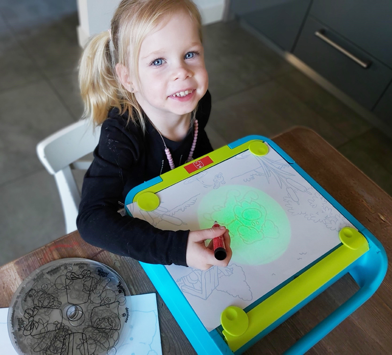 De Dessineo is makkelijk in gebruik, de kinderen kunnen de handelingen stap voor stap zelf doen. De sjabloon past bijvoorbeeld maar op één manier op de draaischijf en kan dus nooit verkeerd bevestigd worden. Op de draaischijf staat een pijl naar welk kant je hem op moet draaien dus ook dat is super makkelijk. Wanneer de klep dicht gemaakt word en je er een tekening oplegt zie je de sjabloon meteen erdoorheen komen. Nu teken je in 4 stappen je patroon over.
