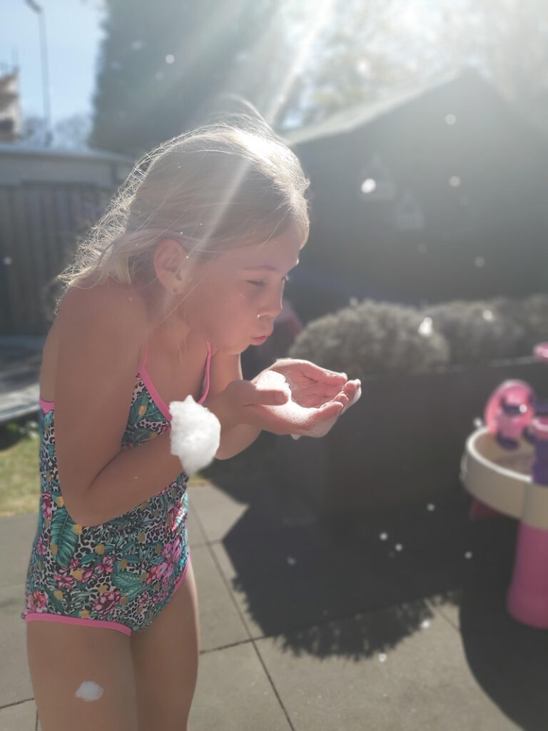 We mogen alweer even genieten van het mooie weer en dat wil zeggen dat alle buiten spelletjes en speelgoed weer voor de dag getoverd is. Natuurlijk is er tijdens deze warme dagen niks leuker dan kliederen met water en zand. Zo ook hier, alleen ben ik wel ieder jaar opnieuw angstig voor één ding in het speciaal; De bellenblaas!!