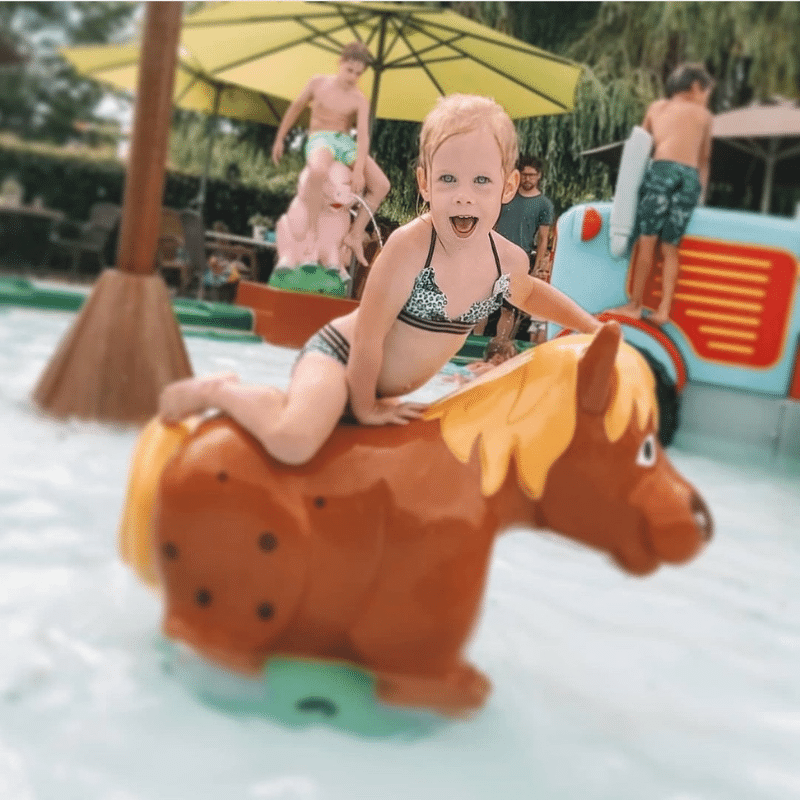 Ook buiten is aan alles gedacht. Een mega luchtkussen, kabelbaal, skelterbaan mét stoplichten, dans regenboog een grote zandspeeltuin en her en der staan nog andere speeltoestellen. Dan is er ook nog een waterspeeltuin waar de kids heerlijk kunnen afkoelen. Het water komt niet hoger dan de knietjes van een peuter (maar opletten blijft natuurlijk altijd je eigen verantwoording). Voor de stoere kids kun je een outdoor lasergame afhuren.