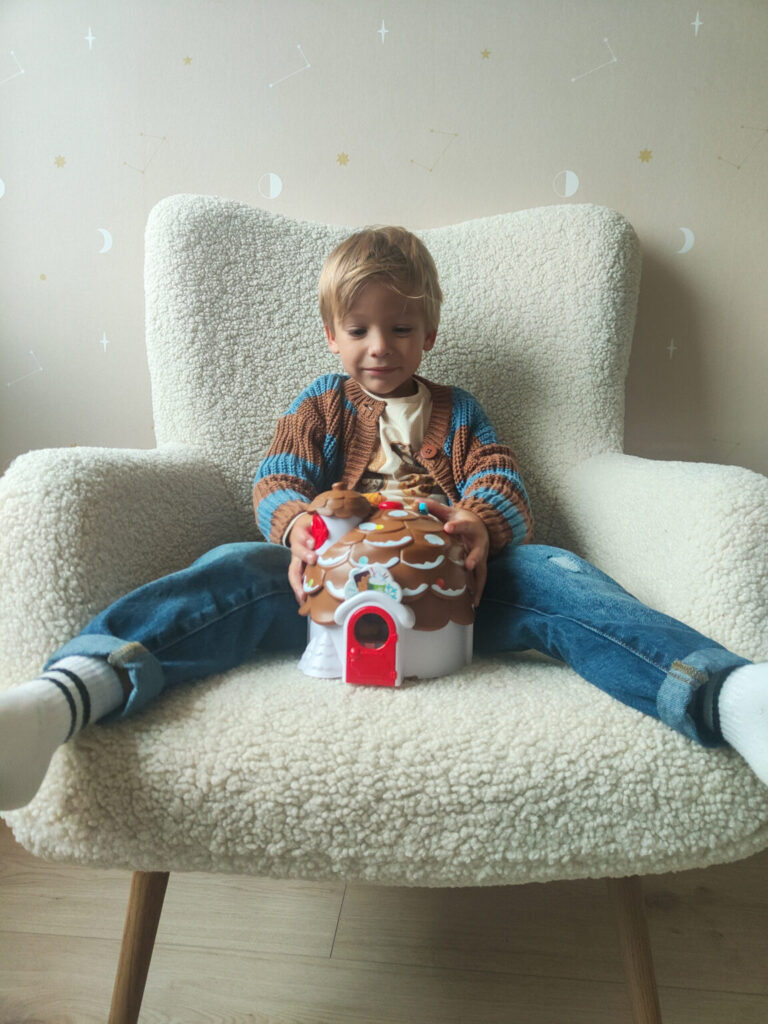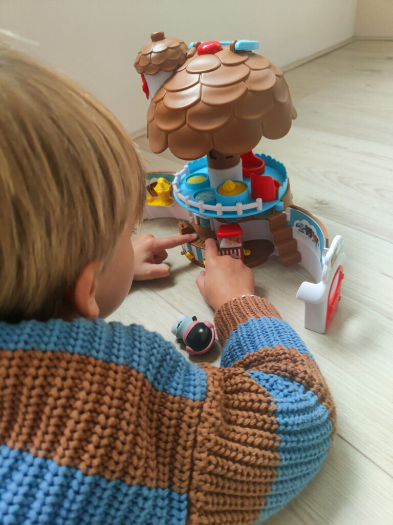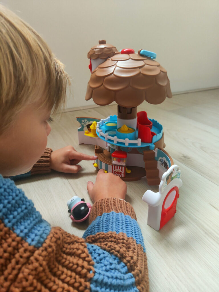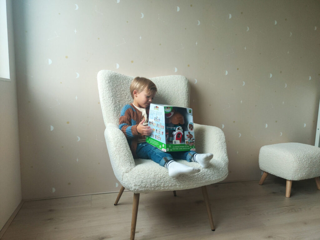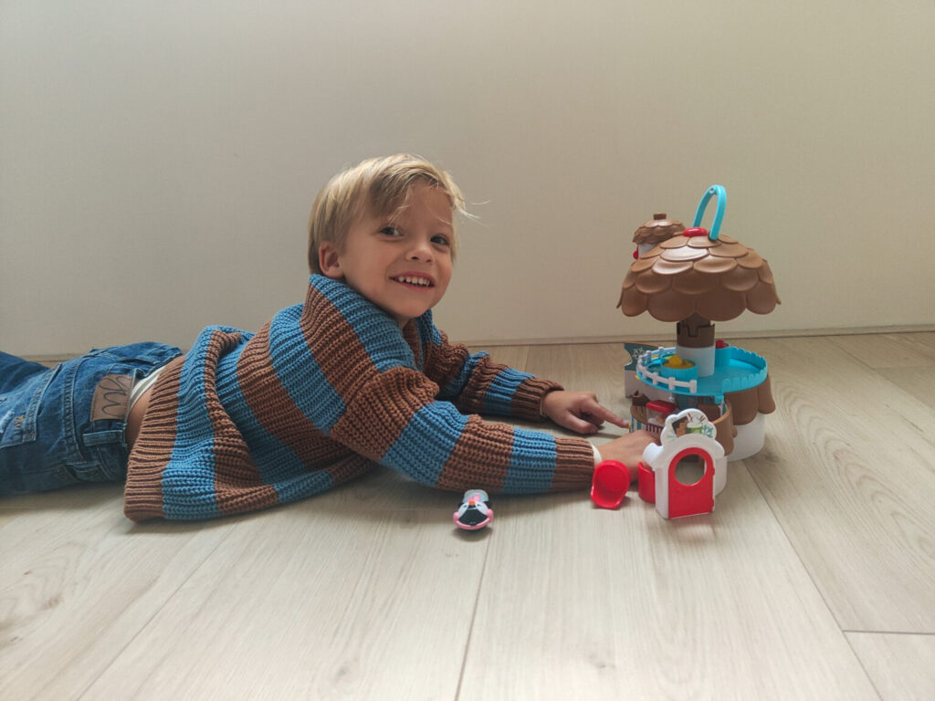 Morris pakte vol enthousiasme de Dennenappel uit en wilde er uiteraard meteen mee spelen. De leeftijd die wordt aangeraden is 1,5 tot 5 jaar en hier zit Morris met zijn 4 jaar dus nog prima bij. Hij had direct door hoe de dennenappel opengeklapt kon worden en ging vervolgens op ontdekkingstocht naar de verrassende en leuke activiteiten die hij kon uitvoeren. Het poppen van popcorn was direct een hit en ook het verstopplekje in het dak trok zijn aandacht. Toen wij vertelde dat we even naar oma en opa zouden gaan moest de Klorofil Dennenappel uiteraard mee zodat hij er met oma mee kon spelen.