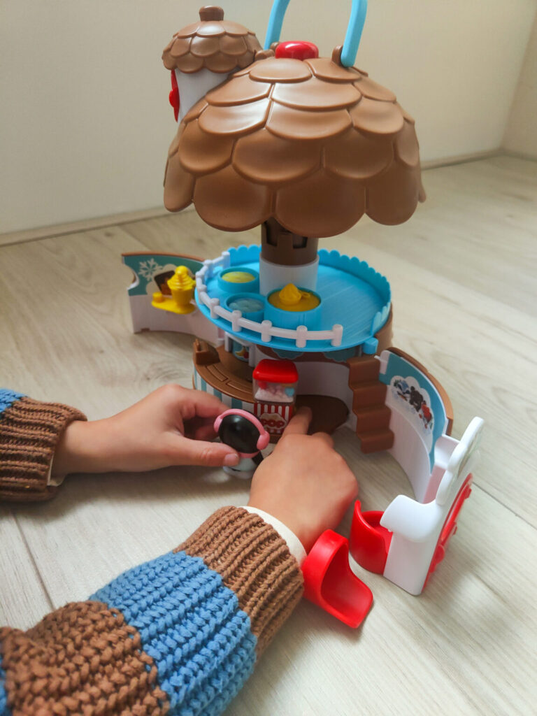 Wat ik als ouder dan weer erg prettig vind van de Klorofil Dennenappel is dat alle accessoires bewaard kunnen worden in de speelset. Bij de Dennenappel zit standaard één speelpoppetje maar er is ruimte zat om er meerdere in te doen en mee te nemen. De Dennenappel is namelijk ook makkelijk mee te nemen en Morris kan het door middel van het handvat prima zelf tillen. De stickers moeten wel zelf opgeplakt worden. Wat ons betreft is dat geen struikelpunt, het waren er niet veel, enkel wat sneeuw op het dak.