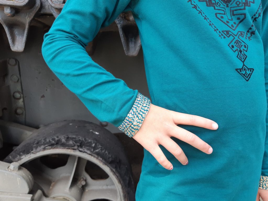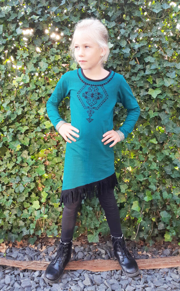 Zodra het setje uit de verpakking was wilde ze het natuurlijk meteen aan. Ondanks dat de zon flink stond te schijnen wilde ze per se lange mouwen en de legging aan. Helemaal prima en een perfecte timing om met de camera op pad te gaan. Wij schoten wat leuke plaatjes met de jurk en door het zonlicht komt de kleur helemaal tot zijn recht. Fay vindt haar ‘indianenjurk’ (zoals ze hem zelf noemt) supermooi en mama’s keuze is helemaal goedgekeurd.