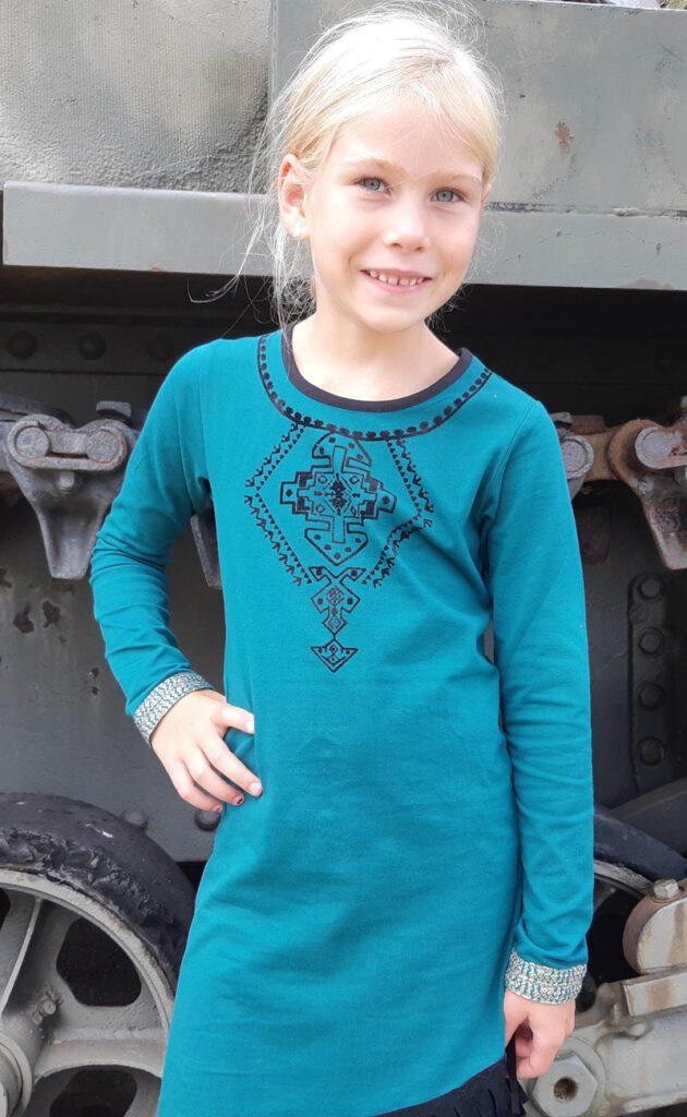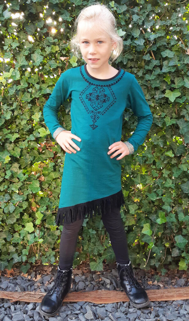 Het pakketje kwam ook geheel in stijl binnen, een mooie gezellige verpakking met aztec print. Fay wilde het graag zelf uitpakken en was heel benieuwd wat mama voor haar uitgekozen had. WOW Mam, was Fay haar eerste reactie en haar ogen gleden over haar outfit heen. Na het bekijken van de kleding was ook ik gevallen voor de ‘Dress aztec fringes – Petrol’. Deze LavaLava jurk heeft een hele bijzondere kleur blauw. Hij is aan de onderkant asymmetrisch en afgewerkt met een randje franjes. In de halslijn zit een mooie Aztec print en de mouwtjes hebben een gouden randje. Het jurkje zit als gegoten en valt haar heel mooi om haar slanke lichaam.