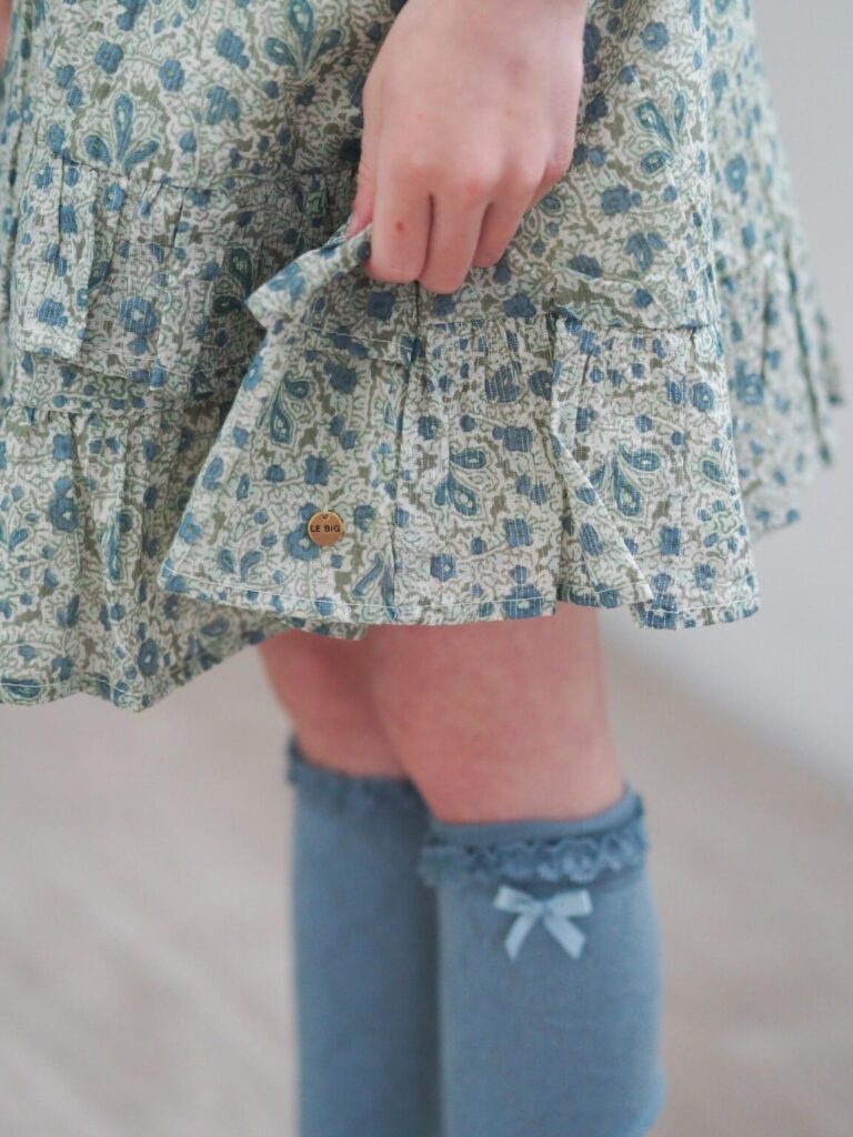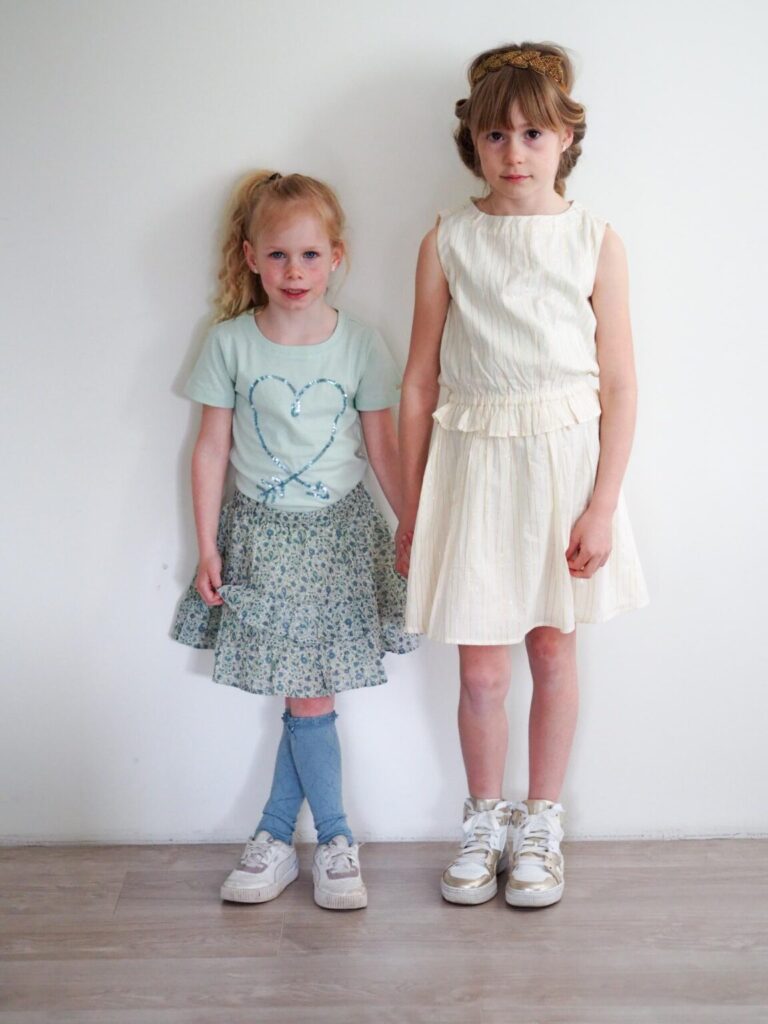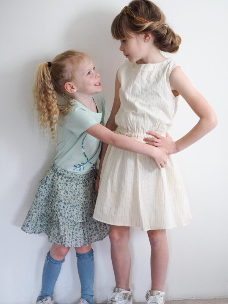 Maatinfo van deze meisjeskleding: Jez draagt haar jurkje in maat 122/128 bij een lengte van 127 cm, ze heeft een smal postuur. Vie draagt haar set in maat 110/116 bij een lengte van 111 cm en heeft ook een smal postuur. De kniekousen zijn maat 27/30 bij schoenmaat 28.