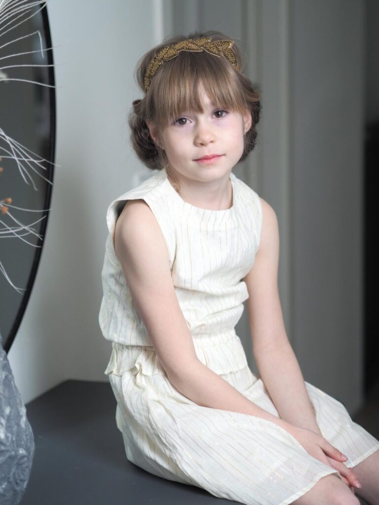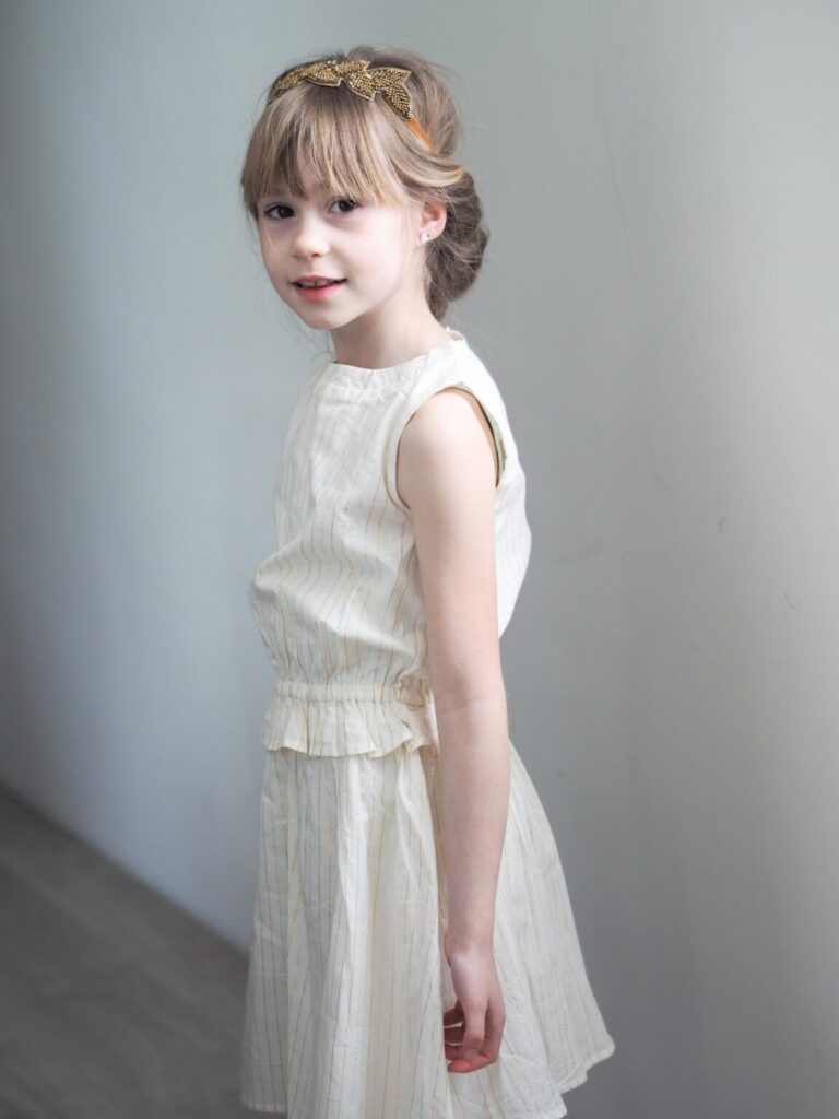 In deze blog laat Jez jullie een jurkje zien uit de Golden Girl collectie. Dit off-white jurkje ‘Zilva’ heeft een all over streepjes motief van zilver, goud en koper en is perfect voor speciale gelegenheden. De nekpartij is afgewerkt met een klassieke lijn en op de taille zit een mooi ruffel die het jurkje een romantische touch geeft. Om het geheel af te maken draagt Jez de koninklijke ‘Wynn’ haarband in haar haren. Deze is gemaakt van kleine kraaltjes en is verkrijgbaar in de kleuren goud en koper. Jij steelt de show op ieder feestje met deze geweldige Golden Girl look.
