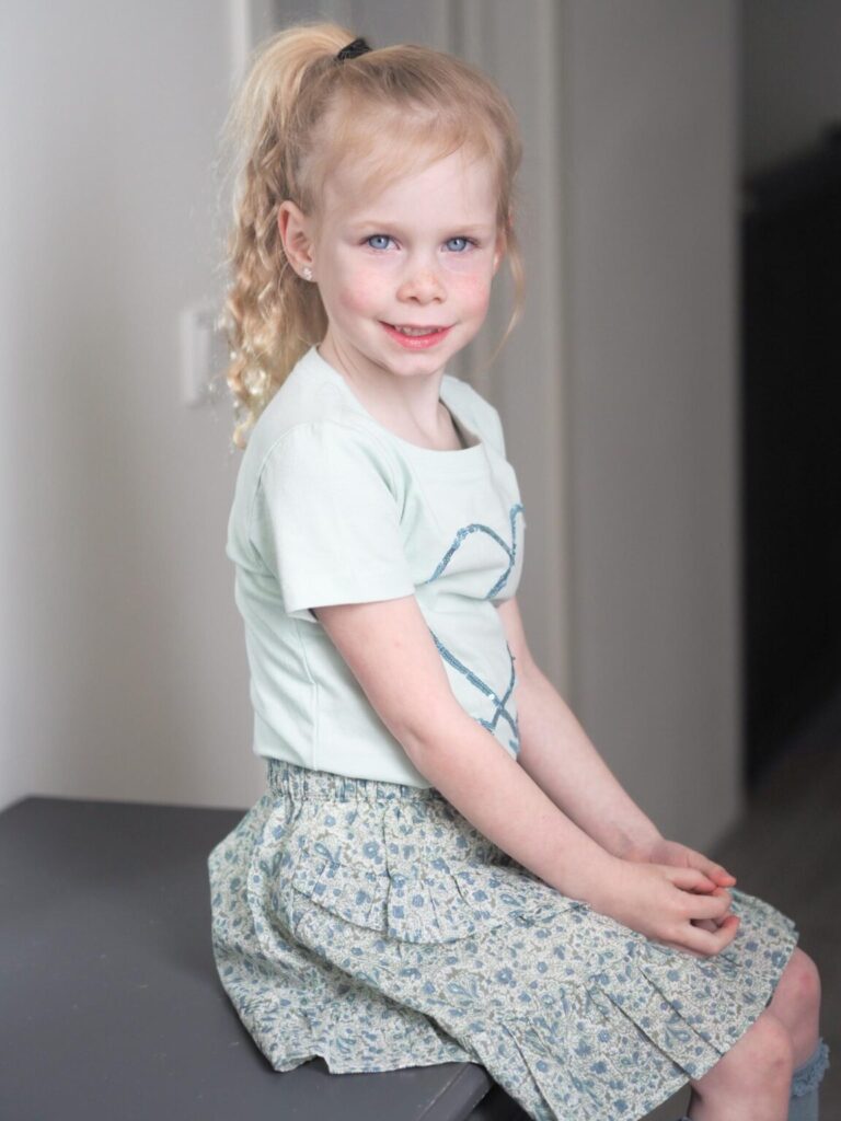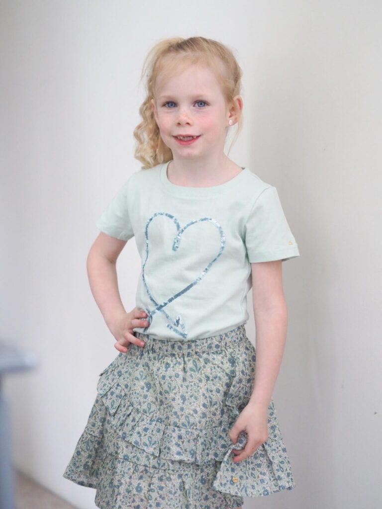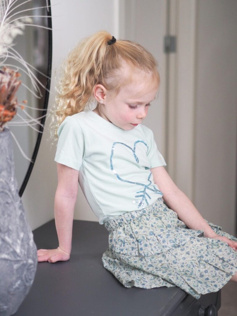 Vie waant zich in de boho sfeer met een geweldige set uit de Bohemian Flower collectie. Je krijgt het ultieme zomer gevoel van dit mooie bloemen printje wat in deze collectie centraal staat. Vie draagt het zwierige rokje ‘Zanthe’. Het rokje is afgewerkt met prachtige ruffels en te combineren met diverse tops in de kleur groen of blauw. Wij kozen voor het shirt ‘Zara’ in de kleur mint en een glitter hart met pijl op de voorkant. Deze look maken we compleet met een paar kniekousen (Utopia), een echte musthave voor onder een jurkje of rokje.