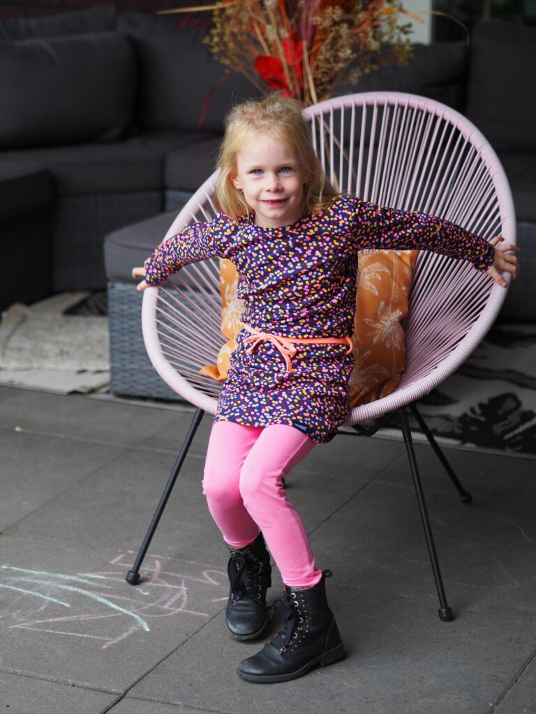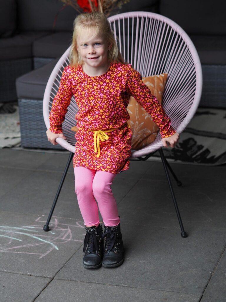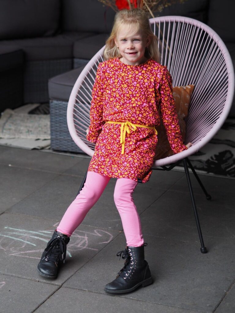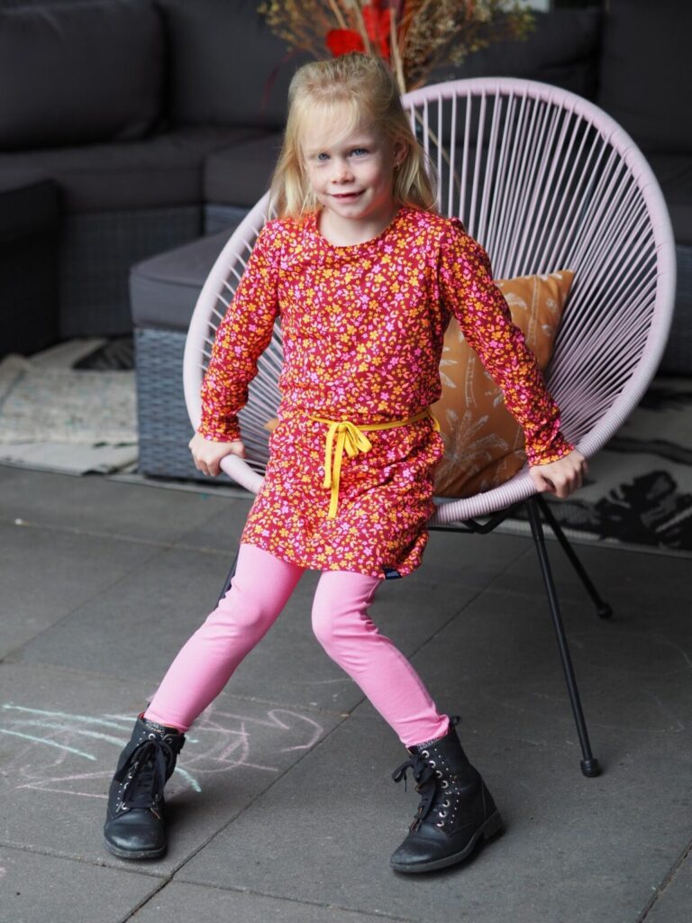 Mijn jurkenmeisje laat jullie twee fantastische jurkjes zien in deze blog. De eerste is een jurkje met een all-over flower print. De basiskleur is burgundi (rood) met bloemetjes in de kleuren geel en roze… Hey zei daar iemand roze, yes that’s right… Meisjes houden van roze! In de taille zit een geel koordje om te strikken. We stylen hem af met de bubblegum kleurige legging. Deze outfit is echt super girly!