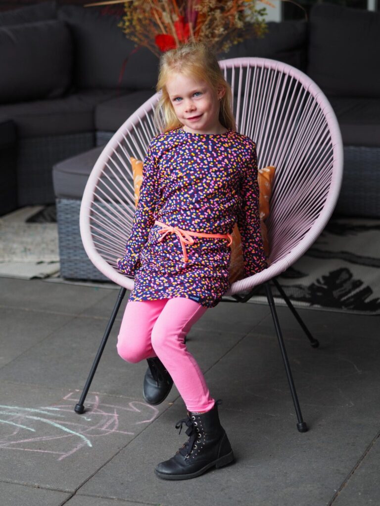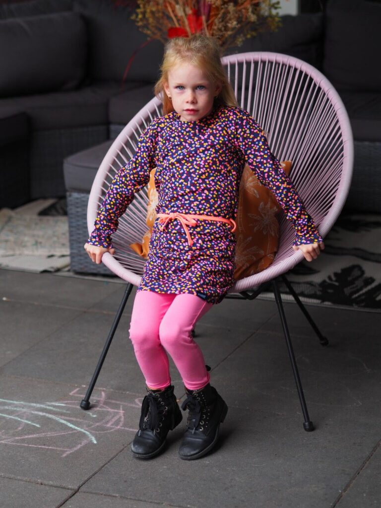 Bij het andere jurkje wat we laten zien draagt ze dezelfde legging als hierboven. Dit jurkje heeft ook een all-over print maar dan met gekleurde stippeltjes. De taille heeft een licht roze koordje en het jurkje draagt super comfortabel. Helemaal vrolijk worden wij hiervan! Oh en die prijsjes…. €16.95 per stuk voor deze jurkjes. Uhuh moeders… Shop shop shop