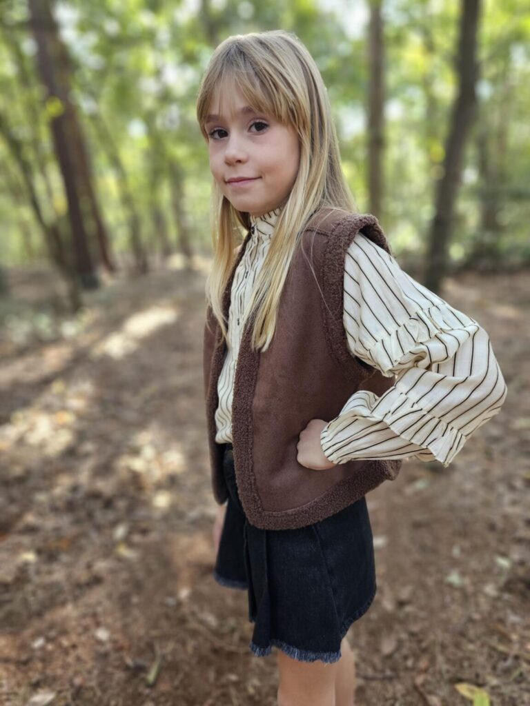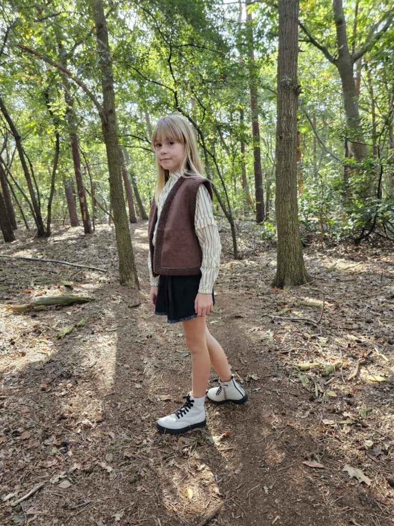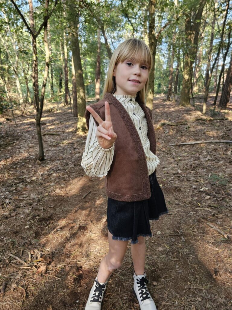 De musthave voor in je kledingkast is een gilet. Jez ging voor het bruine lammy gilet ‘Dana‘ en wat super tof is, is dat je deze aan 2 kanten kunt dragen. Een gilet is super gaaf over een blouse, maar ook zeker over een jurkje of longsleeve. Je kunt dus vele kanten op met een gilet en wij vinden dan ook dat elk meisje er één moet hebben!