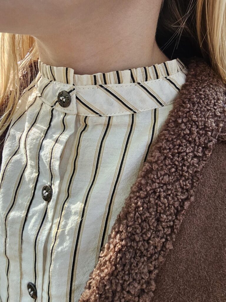 Het eerste waar Jez voor ging was de prachtige blouse ‘Carice‘, deze heeft een luxe uitstraling door de zwarte en zand kleurige streepjes. De roesels en turtle neck geven de blouse net even dat extra verfijnde lookje. Een perfect item uit de collectie van Like FLo om Jez haar OOTD mee te starten.