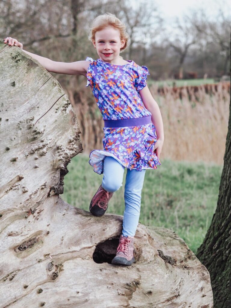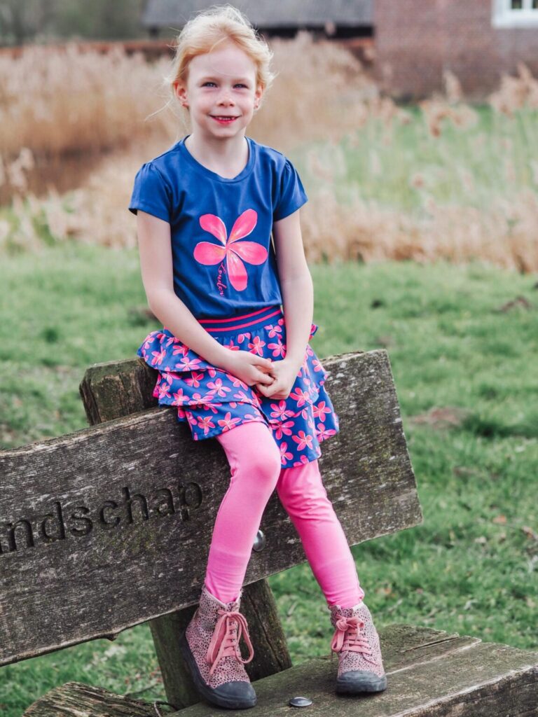 Het laatste wat we laten zien is een jurk in de kleur ‘deep navy’. Op het top gedeelte staat een mooie roze bloem afgebeeld en deze bloem zie je als all-over print terug in het rokgedeelte. De rok bestaat uit stroken waardoor je lekker kunt zwieren… (De legging die we eronder dragen is die van de wintercollectie. Deze kleur matcht perfect!)