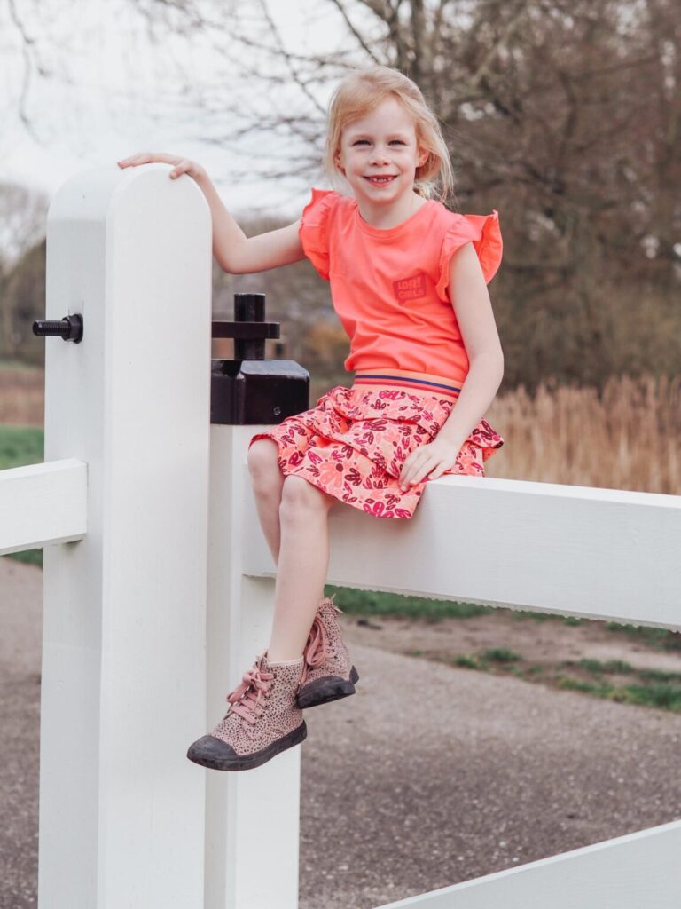 De eerste set die we laten zien is de favoriet van Vie. Een rokje met een shirt. Het shirt heeft een mooie koraal kleur en is voorzien van ruffelmouwtjes. De rok heeft een brede taille stiek met daarop gekleurde strepen. De stof is een all-over funky flower print. De rok zelf heeft verschillende stroken waardoor het direct wat speelser kijkt.