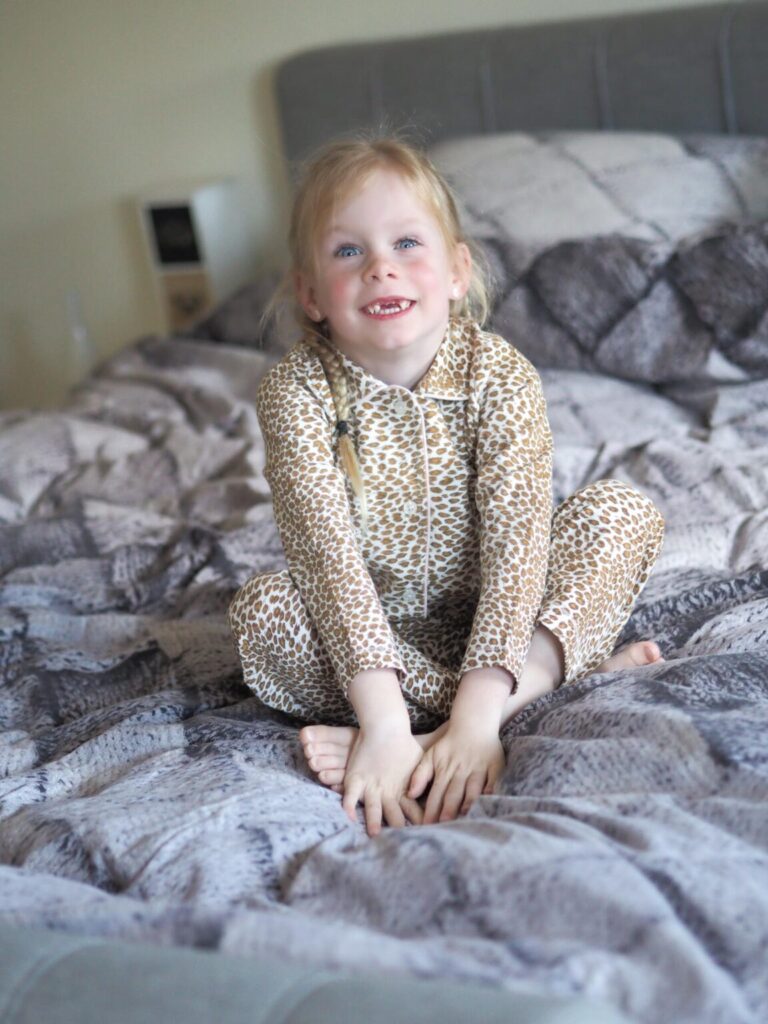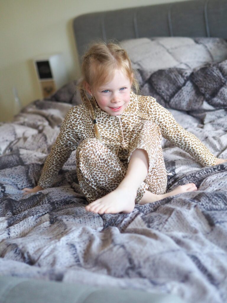 Vie is vanaf nu onze kleinste tijger in bed. Ze draagt de tweedelige ‘Tiger Panther’ set. Het pyjamajasje heeft lange mouwen en een knoopsluiting aan de voorkant, de stof is heerlijk zacht en dun, perfect voor de lente. De broek heeft een roze aantrekkoordje en het roze zie je terug in de stiksels van de pyjama. Vie draagt de pyjama in 104/110 bij een lengte van 106cm.