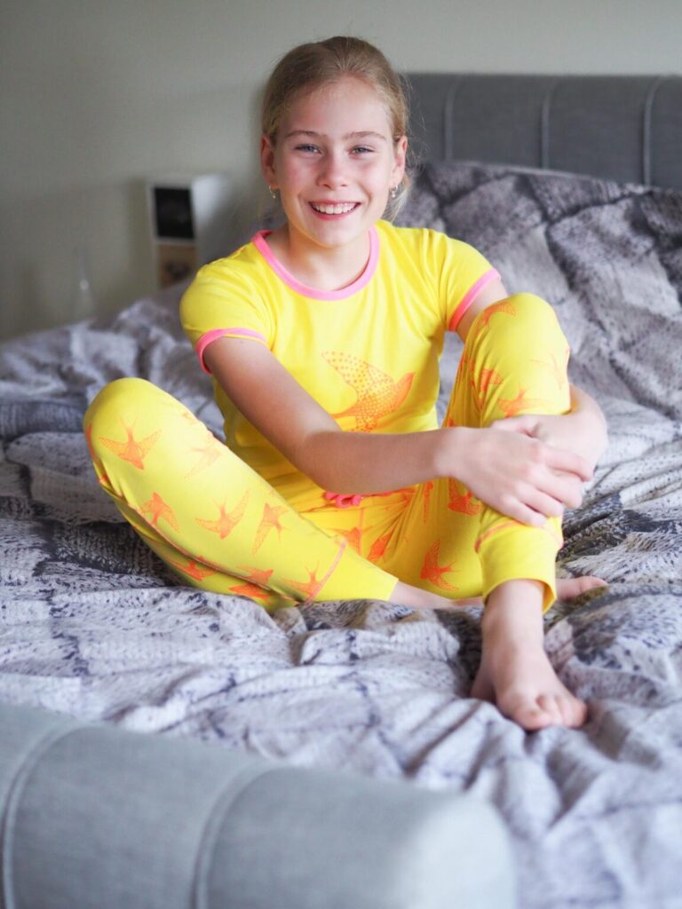 Fay is het zonnetje in huis met haar knalgele pyjama ‘Birds’, dit is een tweedelige pyjama set. Het shirt heeft korte mouwen die afgewerkt zijn met roze biesjes en op de voorkant een kraanvogel. De broek heeft een all-over kraanvogel print en is afgewerkt met leuke details zoals knoopjes, een strik koordje en een zakje. Fay draagt de pyjama in maat 152/158 bij een lengte van 153cm.