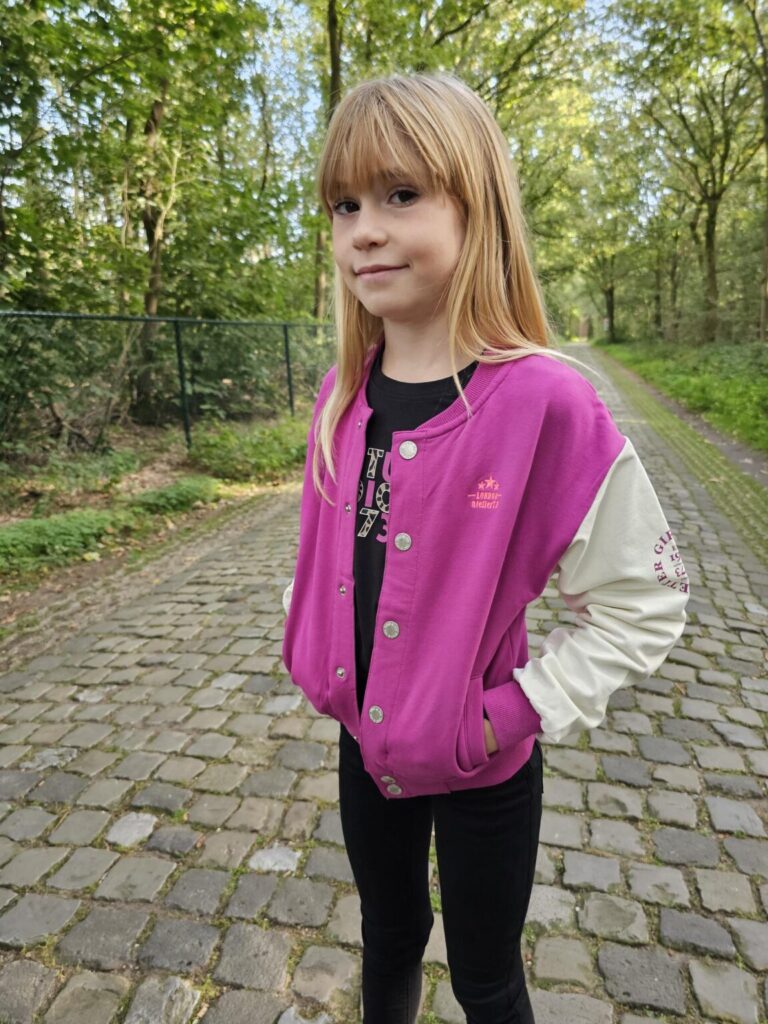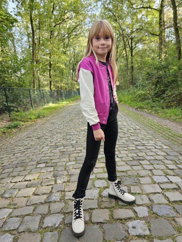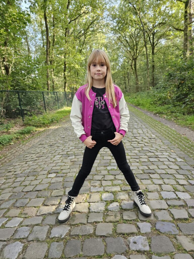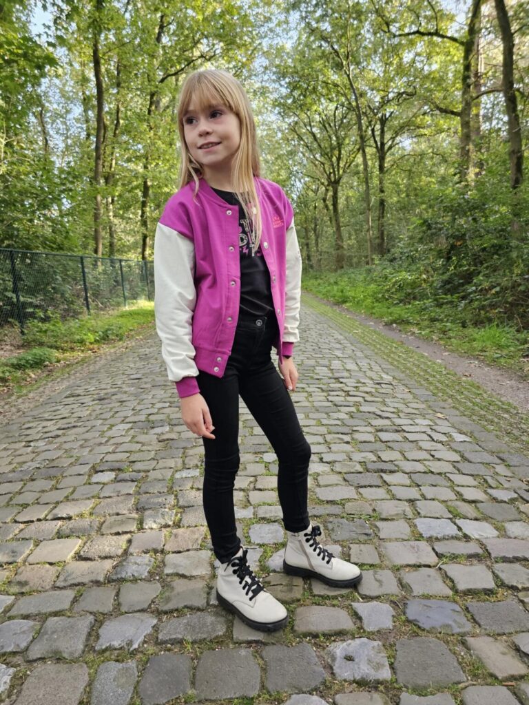 Haar keuze was snel gemaakt bij het zien van de kleding. Haar oog viel direct op het super gave cerise baseball vest. En ik moet haar groot gelijk geven, wat een plaatje om te zien. Ook was ze heel duidelijk dat ze geen rokje wilde maar een stoere broek. Wel eentje die fijn zit en zacht is. Zo kwamen bij de zwarte tregging uit. De looks van een skinny jeans maar de comfort van een legging, perfect om in te dansen.