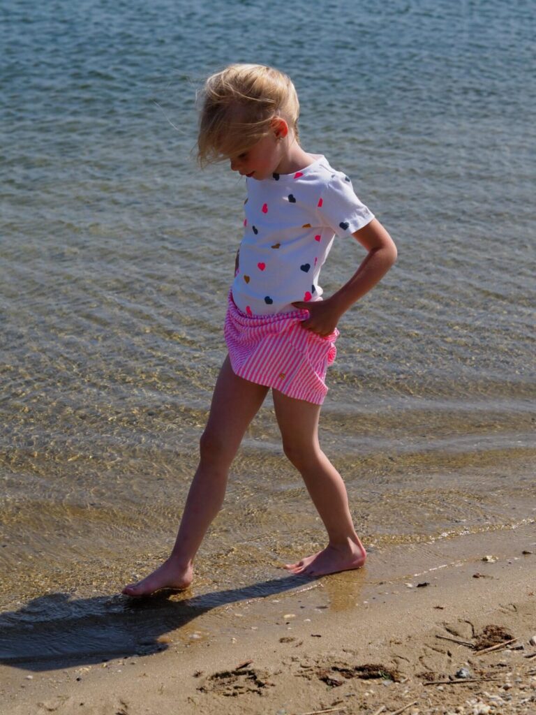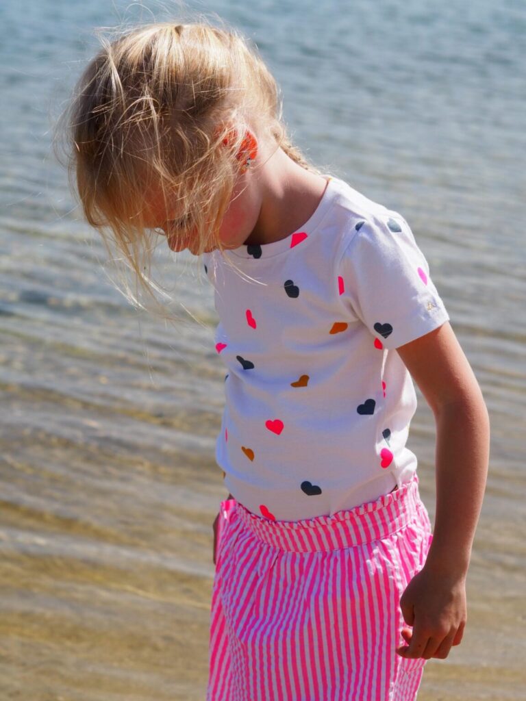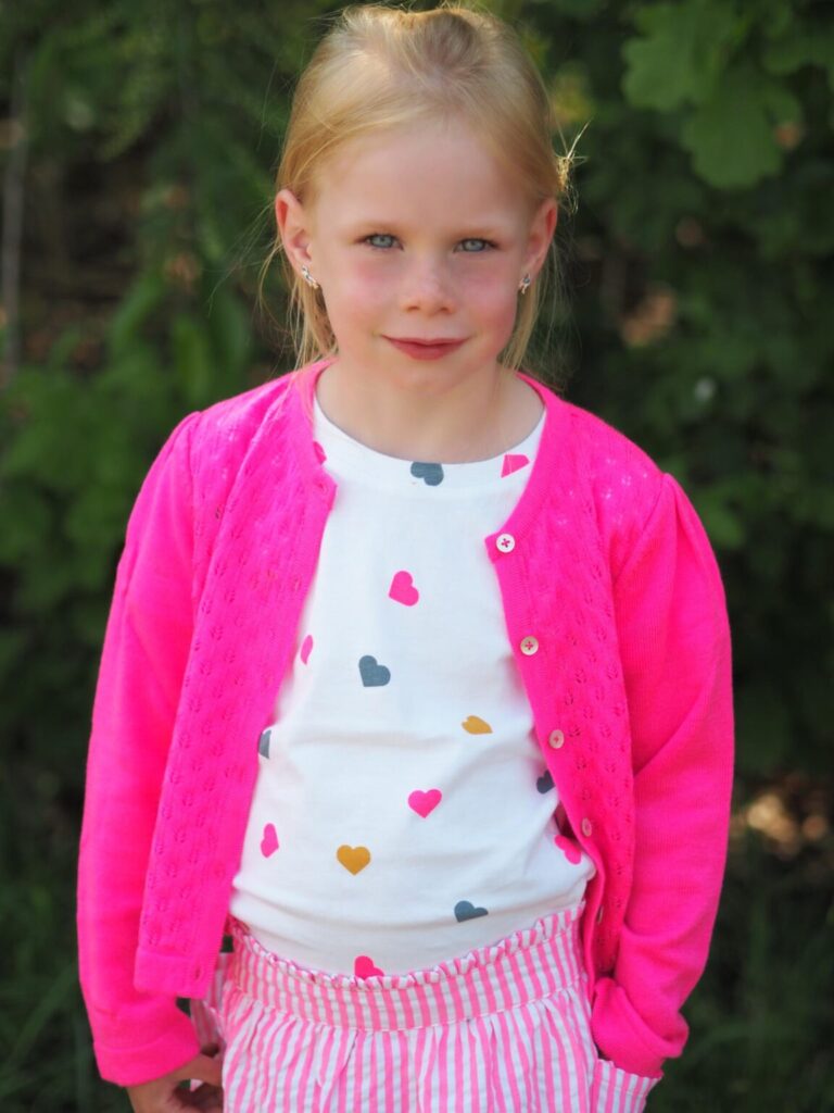 Vie gaat voor een zuurstokroze Le Big look en steelt de show met haar geweldige outfit. Ze draagt een wit/roze gestreept rokje met leuke grote opgestikte zakken met daarop een t-shirt met een all-over hartjes print. De hartjes zijn in diverse frisse kleuren en geven de gehele look een zomerse tint. Om de set geheel af te stylen draagt ze er een paar schattige sokjes onder die afgewerkt zijn met kant en een strikje. Voor de koudere dagen dragen we deze set met het mooie gebreide vestje. Echt een fantastische zomer outfit.