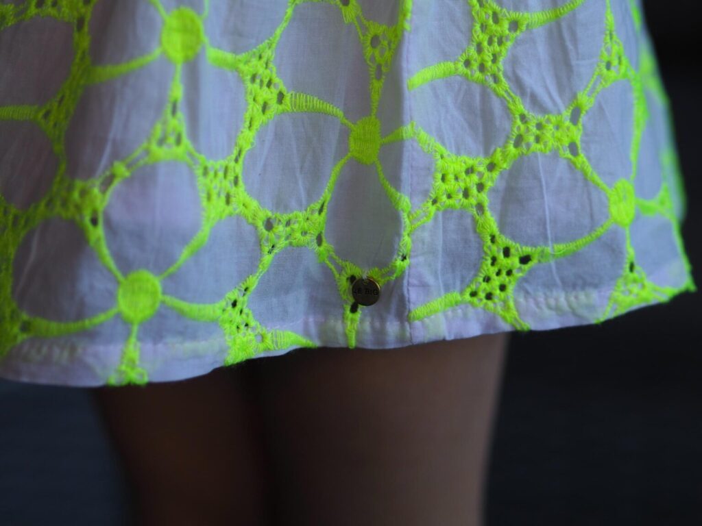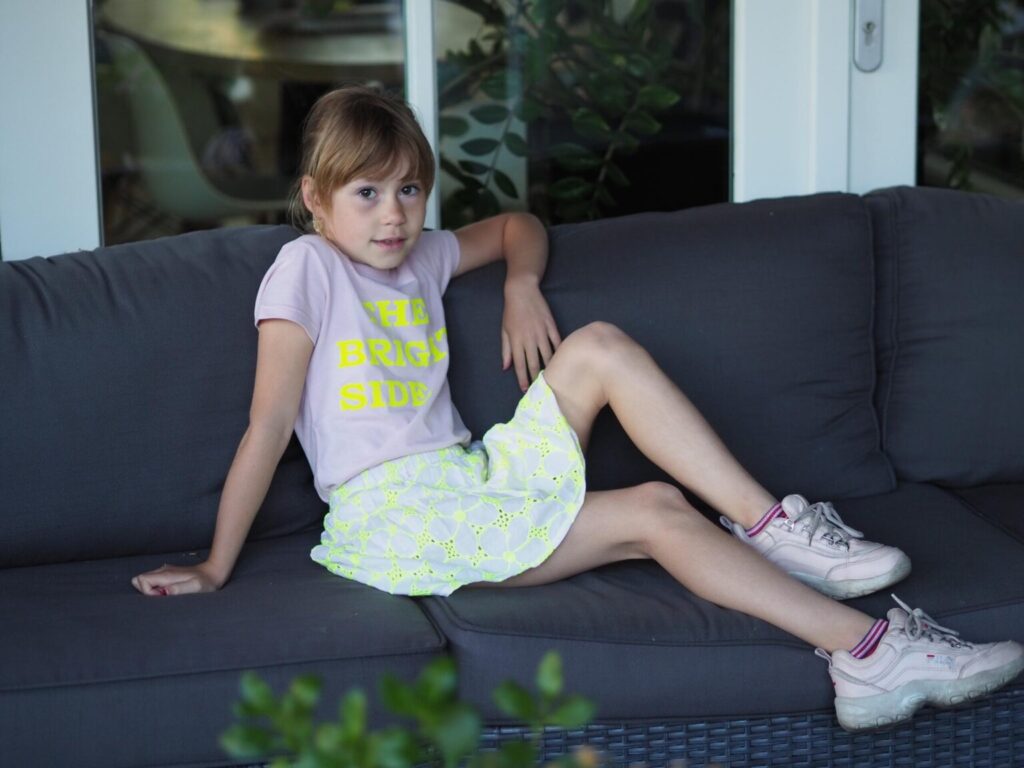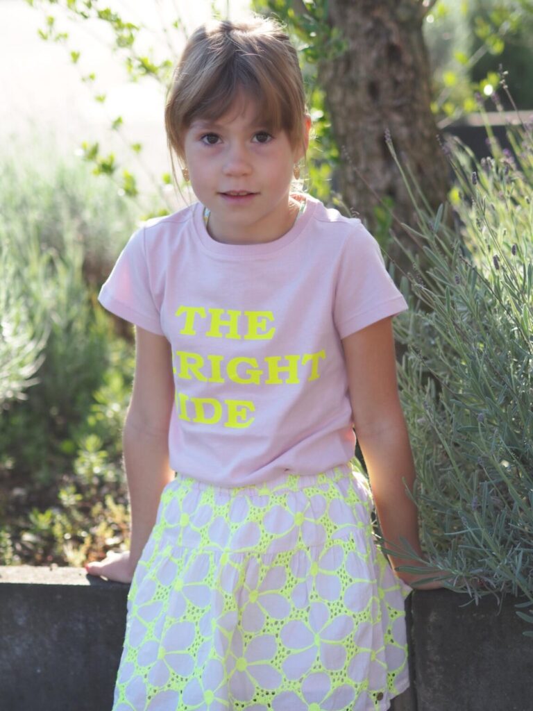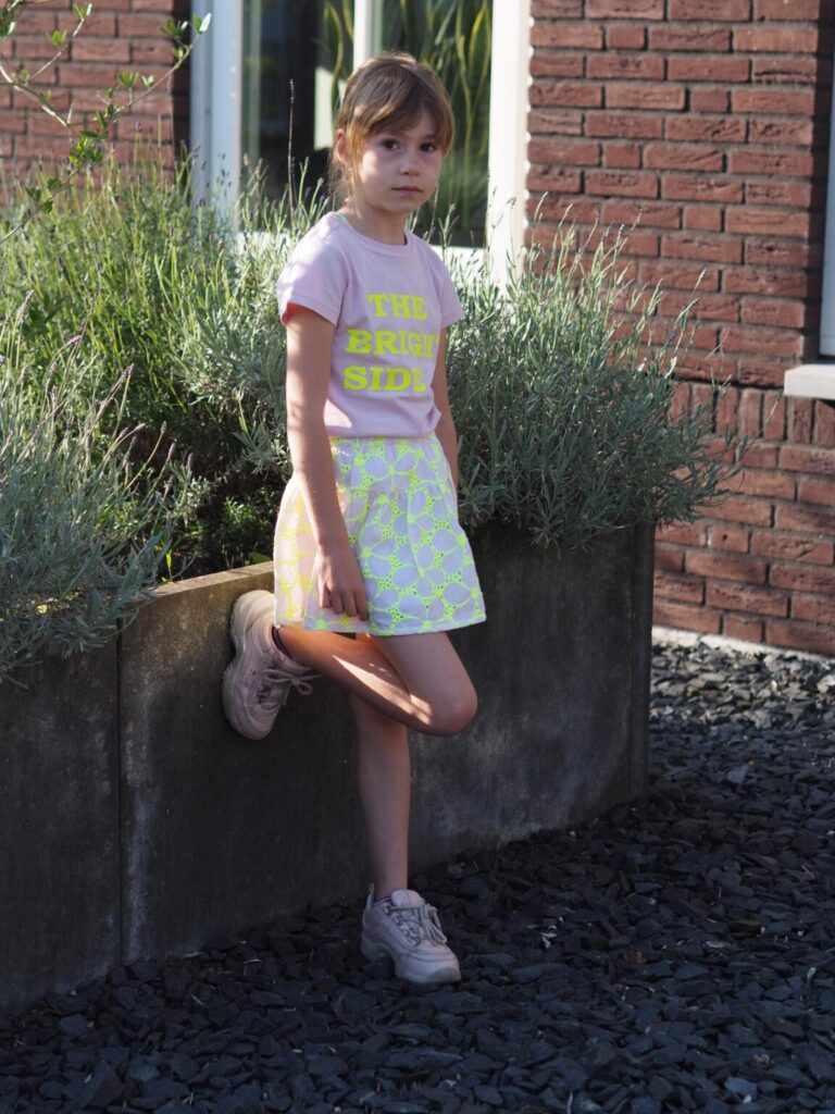 Jez draagt een licht kleurig lila rokje met een all-over bloemetjes borduurwerk in de kleur fluor geel. De rok is gemaakt van katoen en heeft een elastische tailleband. We dragen op dit prachtige rokje een t-shirt gemaakt van biologisch katoen, meteen dus ook een duurzame keuze. Het shirt is voorzien van een neon gele tekst ‘the bright side’. Een heerlijke Le Big set voor deze fijne zomerse dagen.