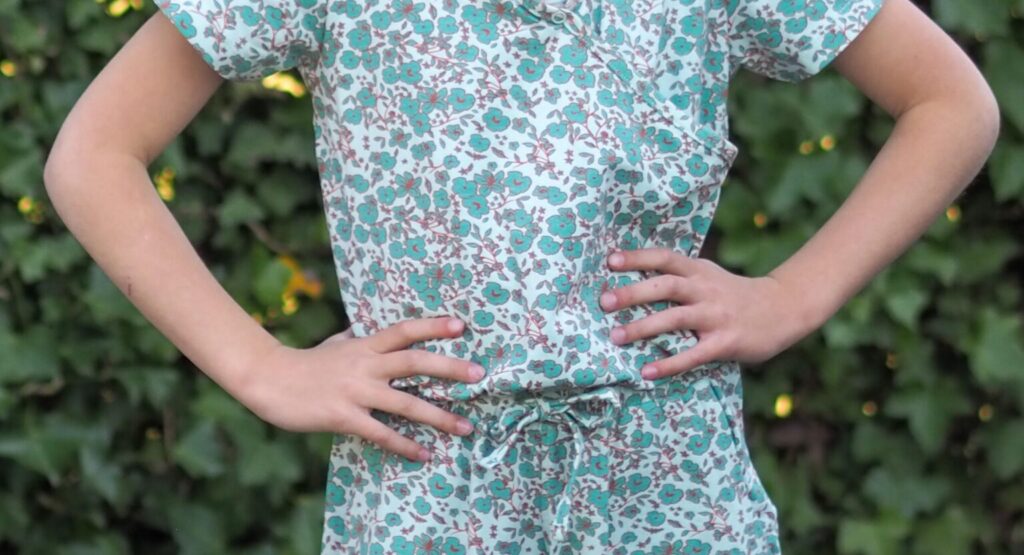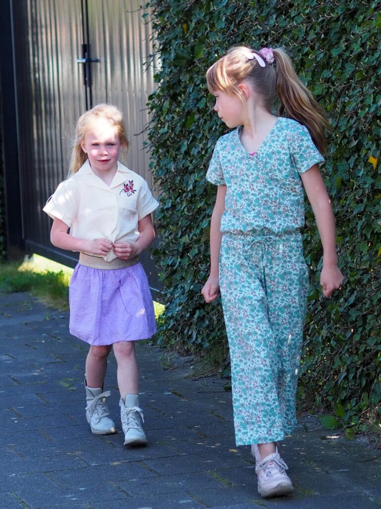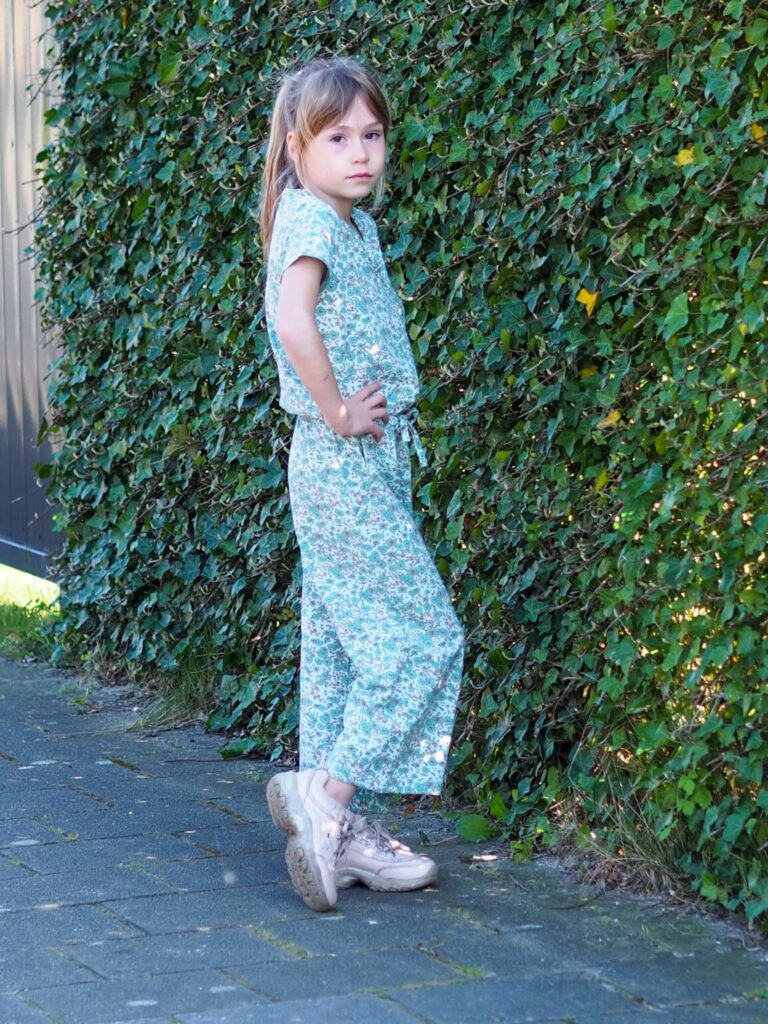 Jez draagt de trots van Moodstreet, een jumpsuit in groene kleurtinten met een print van kleine bloemetjes. Een heerlijk comfortabel pak gemaakt van zacht katoen. De jumpsuit heeft een lengte tot net iets boven de enkel en in de taille een mooi strik detail. De top loopt schuin over elkaar wat het een speelse look geeft. Ze draagt het pak in 122/128 en deze zit perfect! Een fijne Moodstreet outfit voor de lente dagen.
