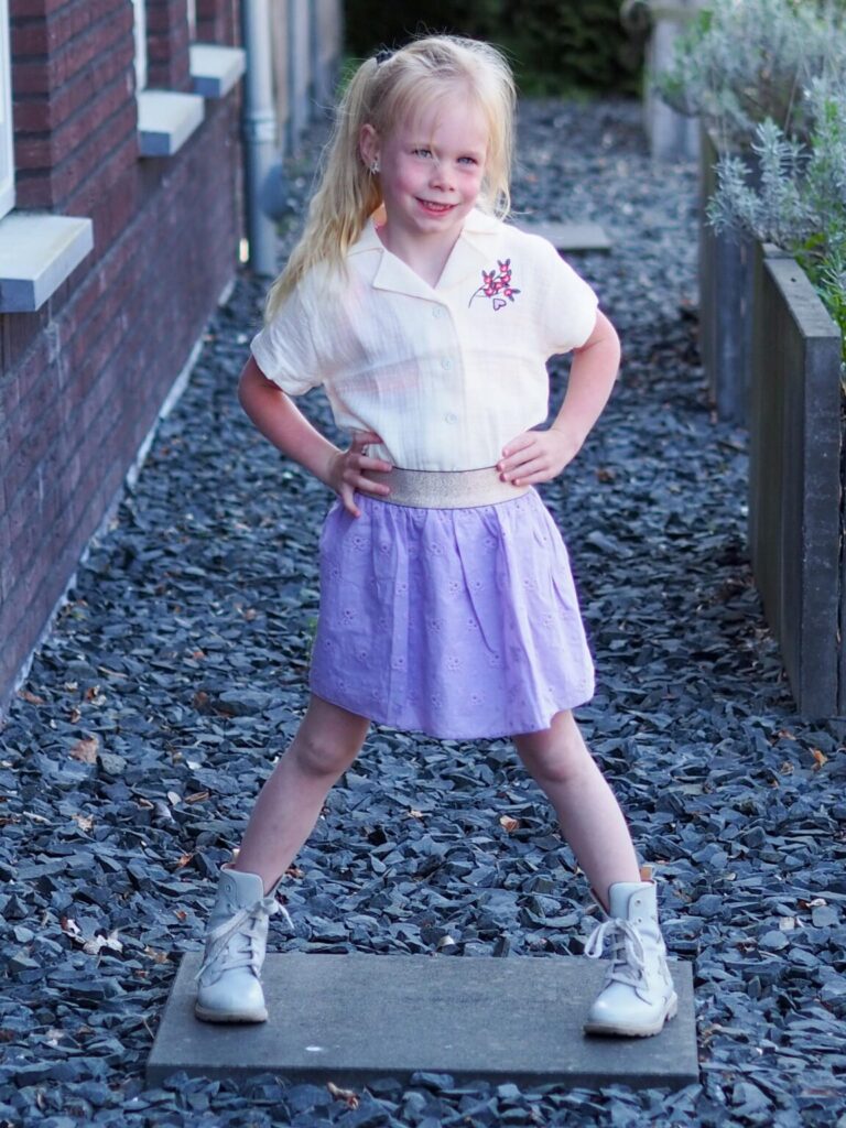 De ogen van Vie begonnen meteen te stralen bij het zien van haar nieuwe Moodstreet outfit. Een mooi offwhite blousje met een subtiel bloemen borduurseltje op de linker borst. We dragen hem op een fantastisch lila rokje. Deze heeft een prachtig opengewerkt broderie en is afgewerkt met een gouden tailleband. Een echt meisjes outfit! Vie draagt deze set in 110/116 en de kleding zit haar als gegoten. In the Mood for a princess look!