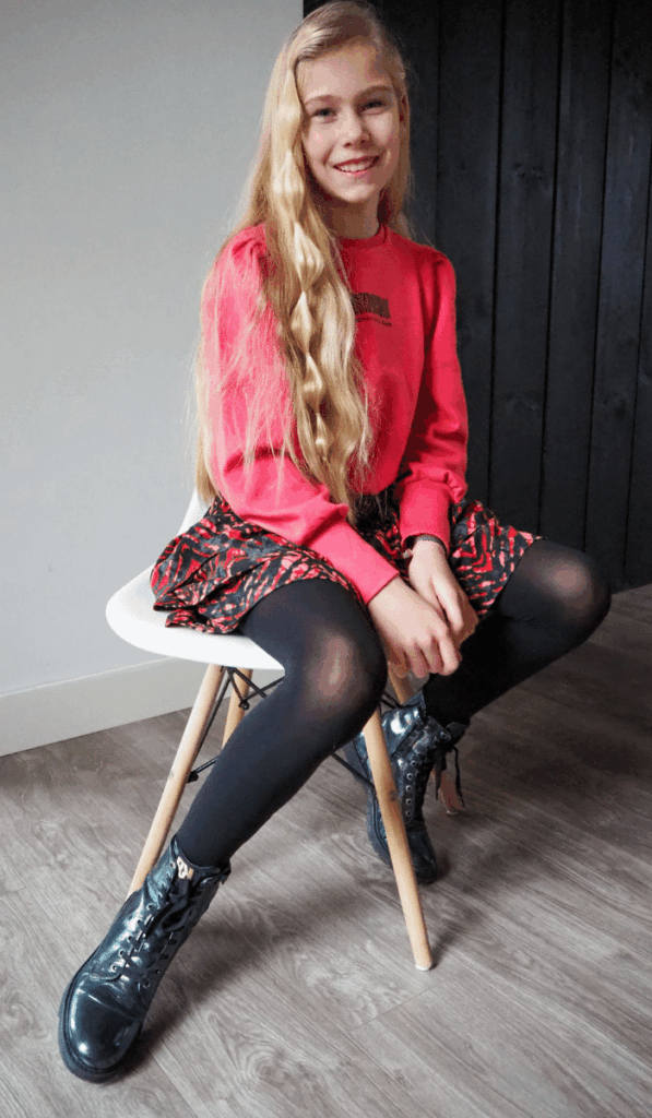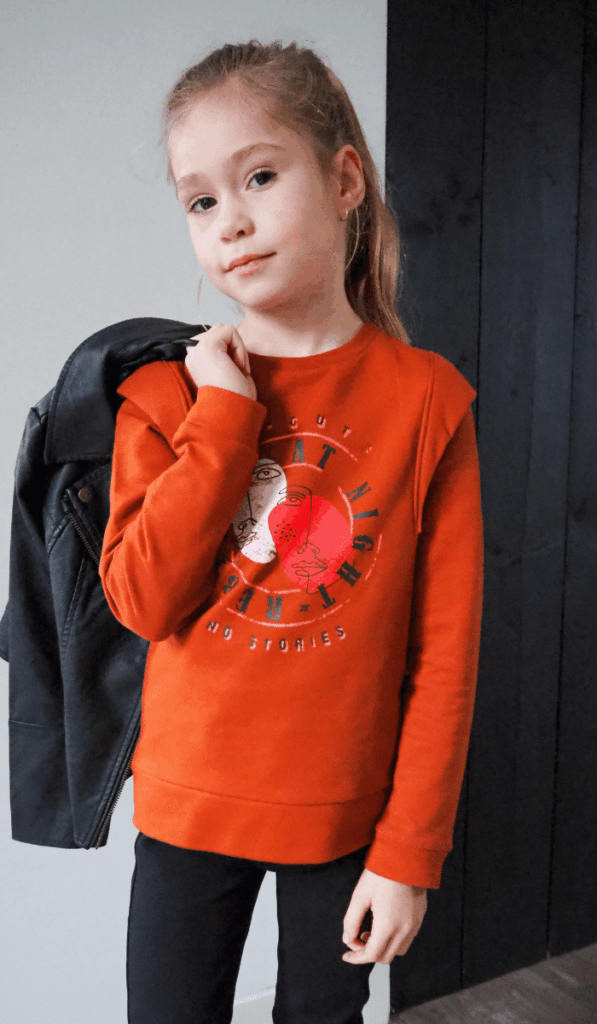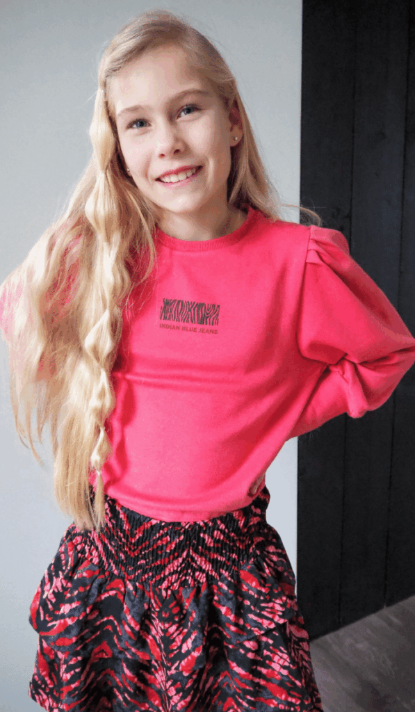 Fay is echt ons meisje meisje en dol op zwierige rokjes en kleurrijke printjes. Ze kreeg dan ook een heel mooi rokje met een tie dye print. Zwart met roze, blijer kun je ze niet maken. Of toch wel! De sweater die ze erbij kreeg viel namelijk ook meteen in de smaak. De trui heeft pofmouwen en is afgewerkt met leuke opdrukjes op de borst en mouwen. Een mooie roze basic voor op de geweldige rok. WE LOVE THIS LOOK!