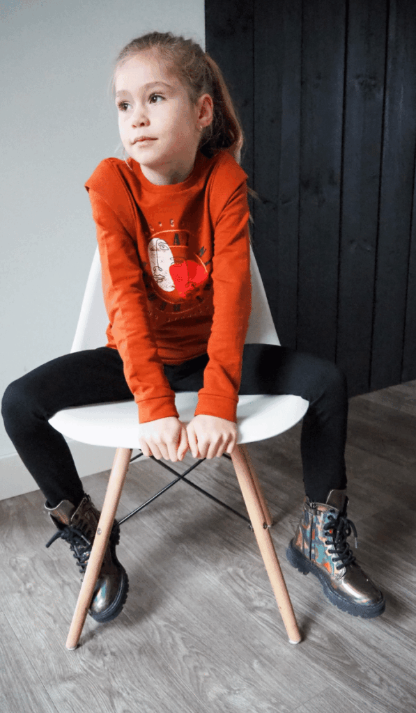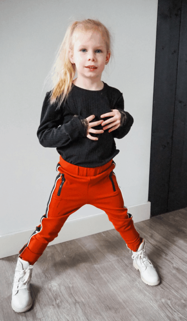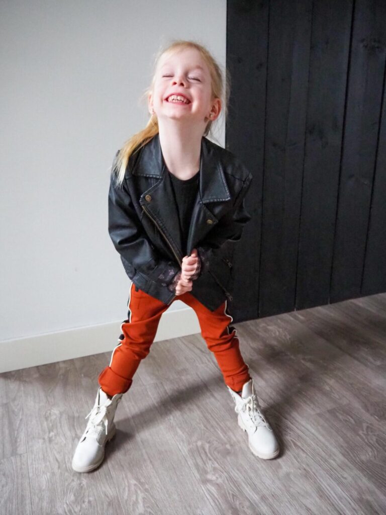 Ook Vie werd verwend met een te gekke set. Ze zit sinds kort op de basisschool en dan is het handig dat ze kleding aan hebben die ze makkelijk zelf kunnen aan en uit doen. Met deze trendy en comfy legging pants kan ze heerlijk klimmen en klauteren en door de elastische tailleband kan ze de broek gemakkelijk zelf aan en uit trekken. De broek is afgewerkt met ritsjes en een stoere bies op de zijkant. In combinatie met een zwarte rib longsleeve met kant aan de mouwtjes word deze set toch heel girly. Het leerlook jasje maakt de set helemaal af en deze kan natuurlijk met heel veel andere setjes gematcht worden.