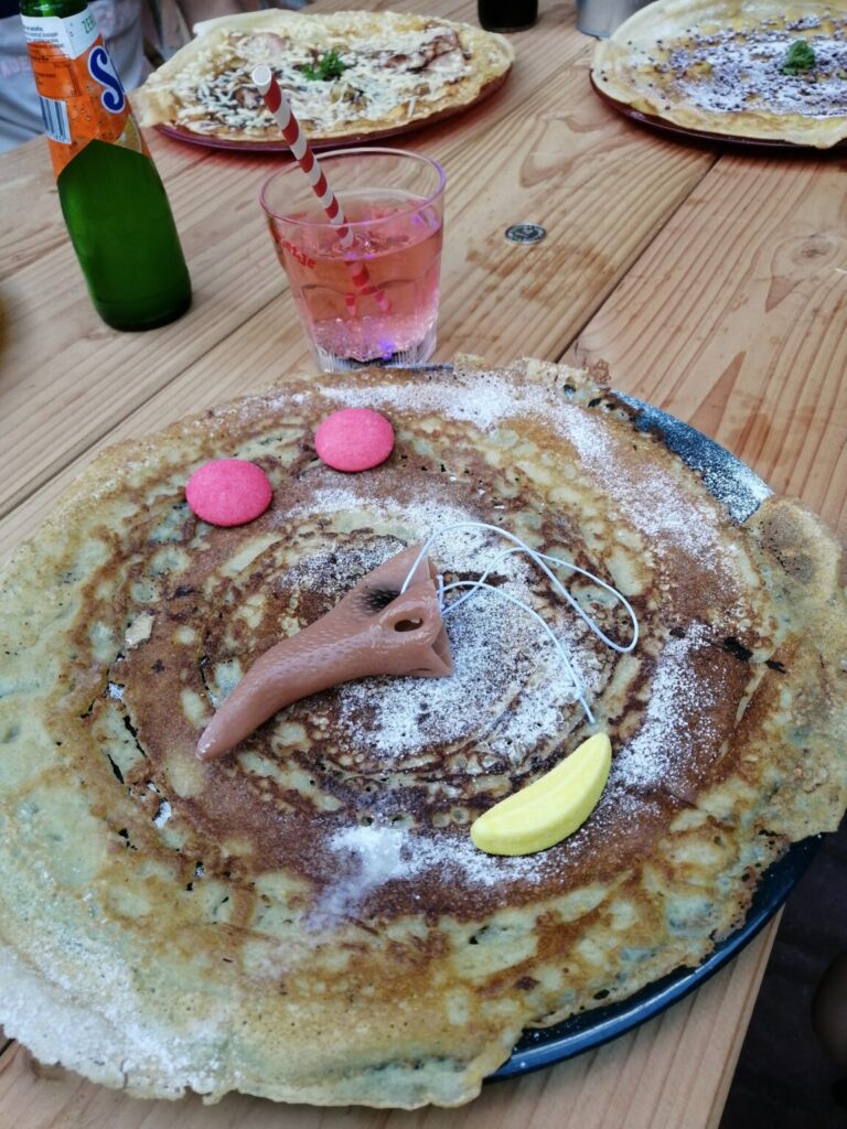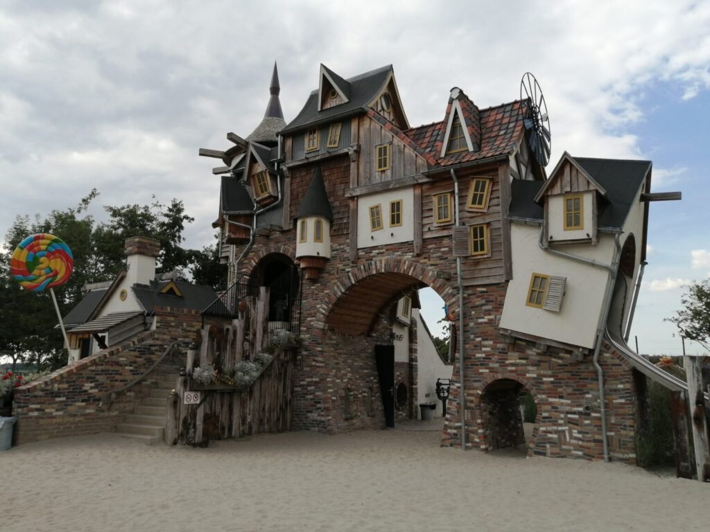 Bij binnenkomst op het terrein zie je al de grote snoeptoren, wat een plaatje! De jongens ben ik al meteen kwijt, want die willen van de glijbaan. We hadden geluk met het weer en konden lekker buiten zitten op het grote terras. Maar ook bij slecht weer is het pannenkoekenhuis een hele belevenis. Binnen zijn er 4 verschillende zalen met elk hun eigen magie. Zo is er een zaal met bewegende vloeren, glitter en glamour en zelfs bewegende tafels. (Voor de bewegende tafels vragen ze wel een toeslag.)
