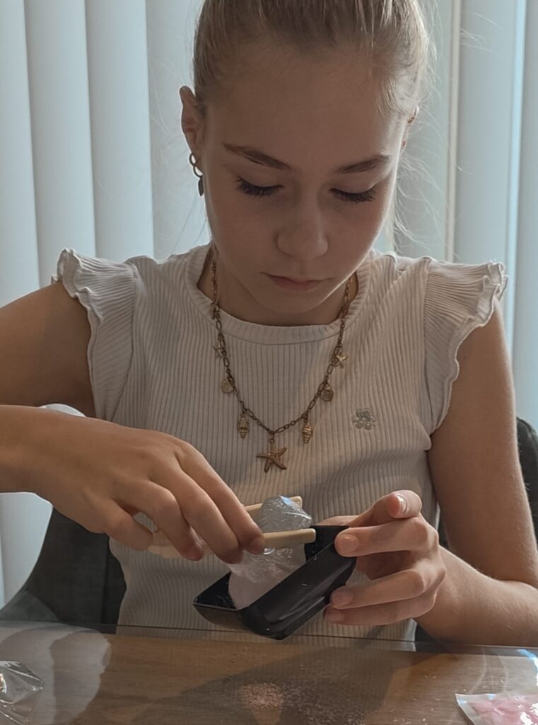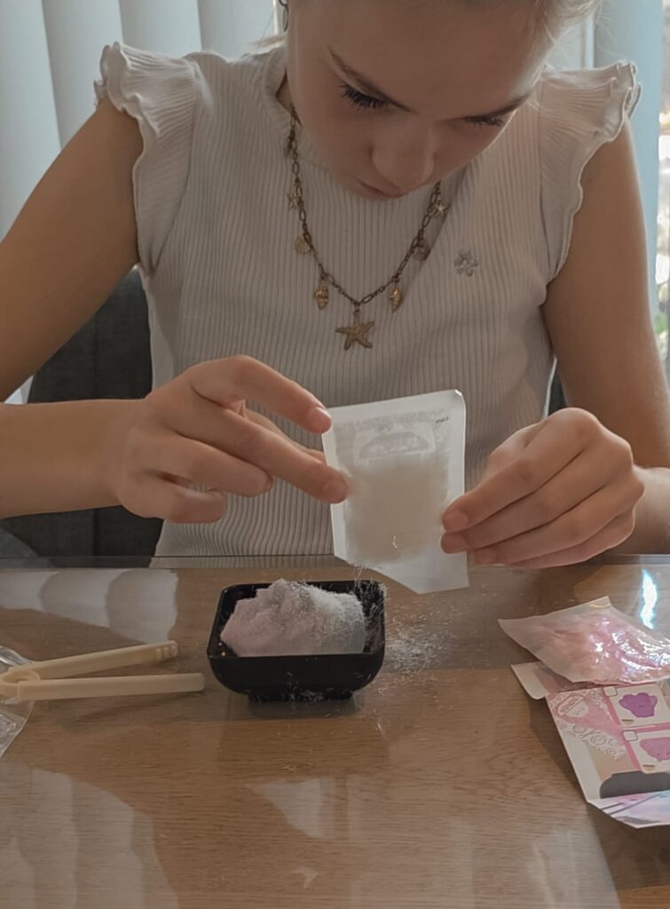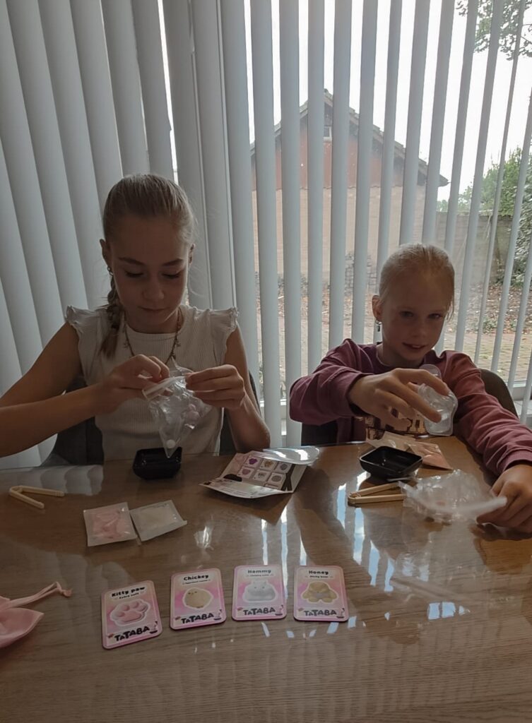 De Tataba Squishies zijn kleine flubberige, heel uitrekbare vormpjes die heel kleverig zijn. Deze kun je versieren met de meegeleverde vezels. Door de plakkracht van de squishy blijven de vezels eraan hangen. Onder de kraan spoel je ze gemakkelijk schoon en kun je weer opnieuw beginnen met versieren. Dat vonden onze meiden wel leuk om te doen.