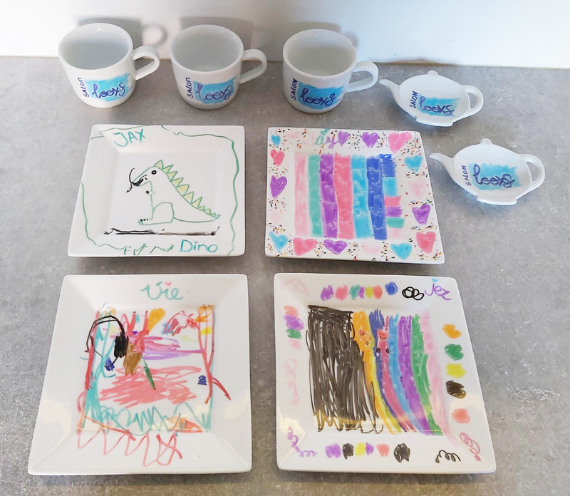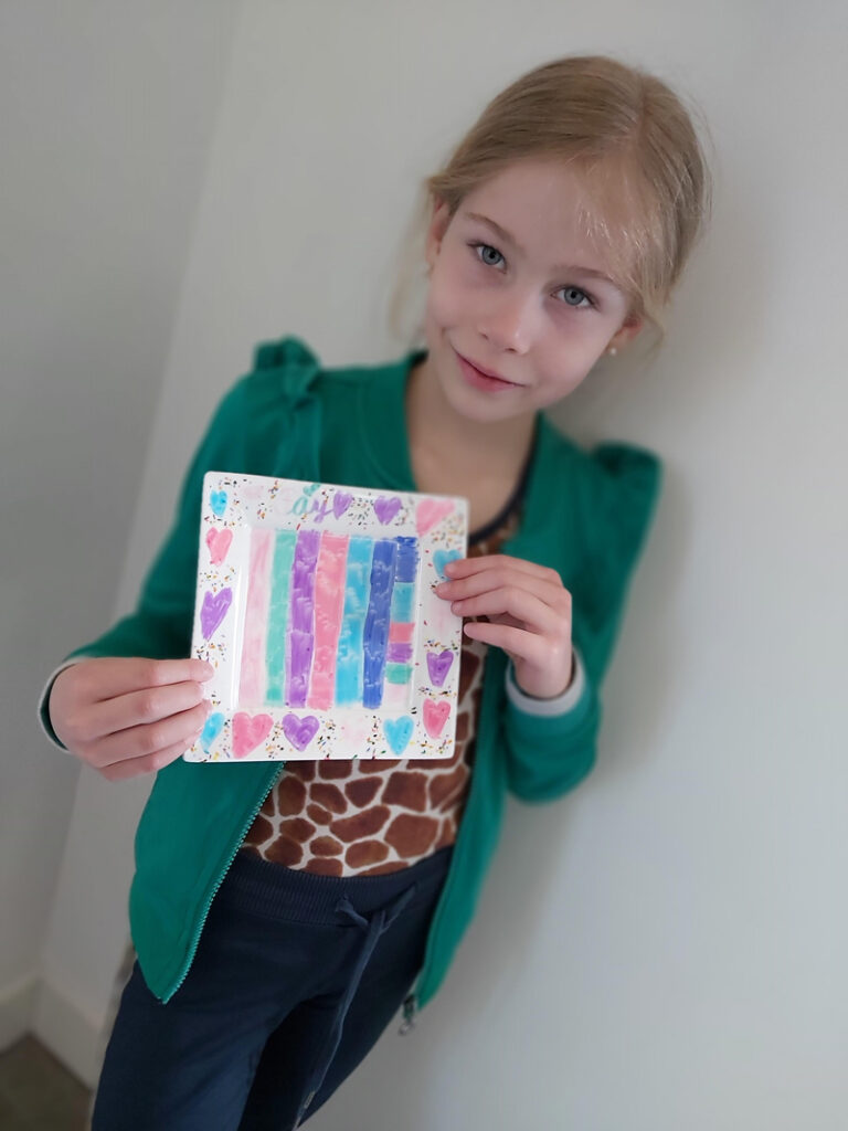 Wanneer je kunstwerk klaar is laat je deze eerst een kwartier aan de lucht drogen. Daarna plaats je het servies in een voorverwarmde oven op 160 graden voor 25 minuten, laat het vervolgens in de oven helemaal afkoelen. Nu is je kunstwerk klaar om te gebruiken en wedden dat je boterhammetje veel lekkerder smaakt van zo’n mooi zelf gemaakt bordje.