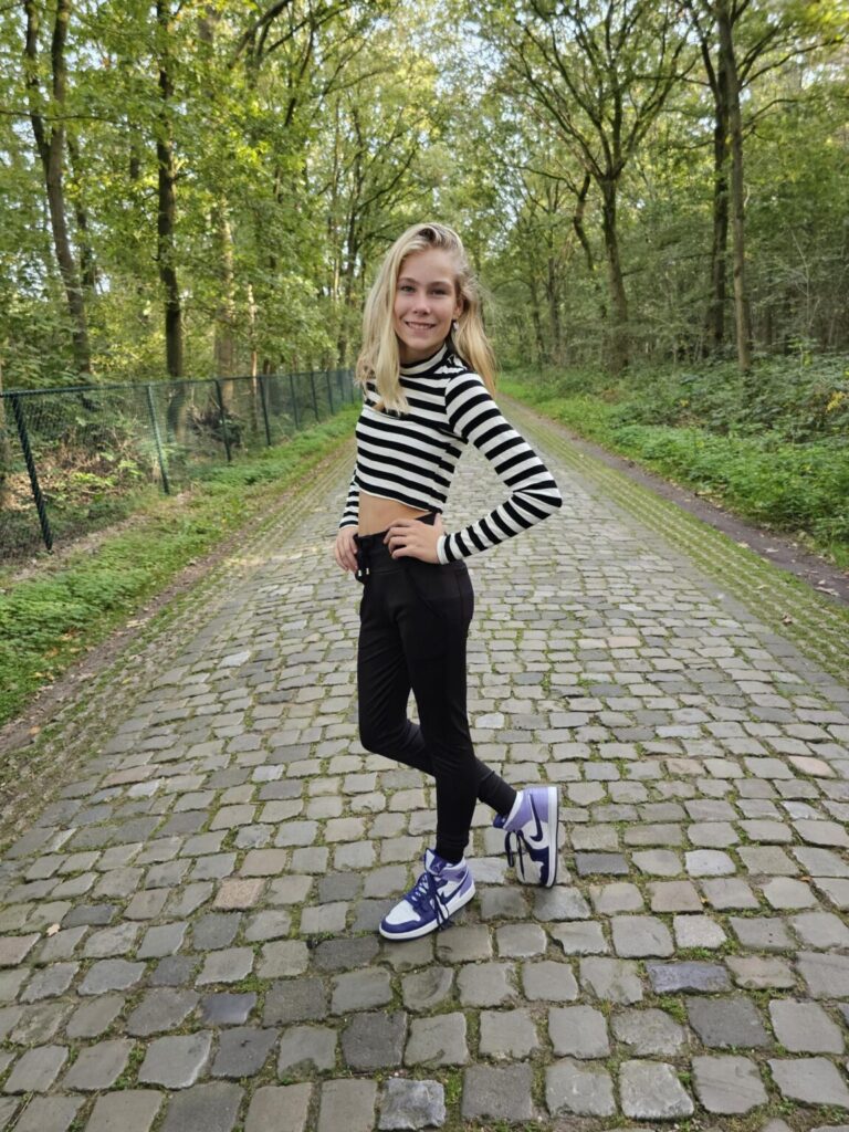 De eerste set die Fay jullie laat zien is er één die vooral heel erg lekker zit. De broek ‘JOJO’ is van travelstof en is mega stretchy. Deze broek had ze al in het donkerblauw en die was veruit haar favoriet. Nu heeft ze dus een nieuw favoriet, want deze is ZWART! Op de broek draagt ze de crop top ‘GARCI’ met lange mouwen in streepjes motief. Niet te veel poespas, gewoon cool!