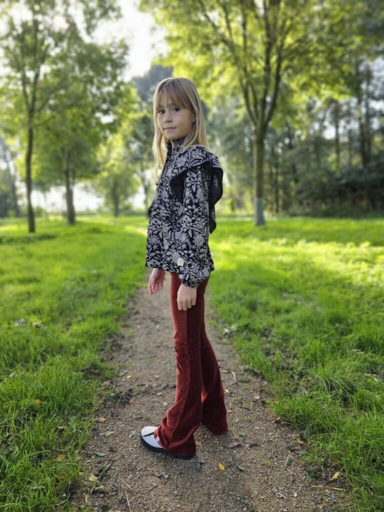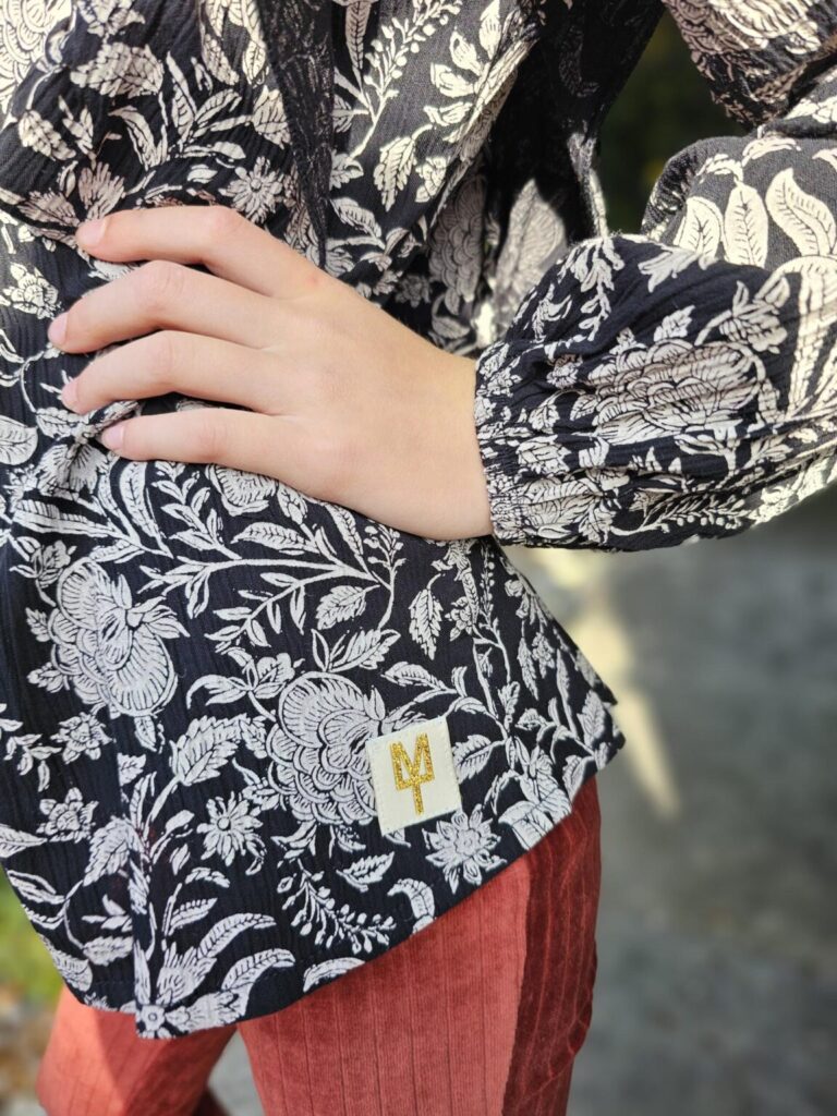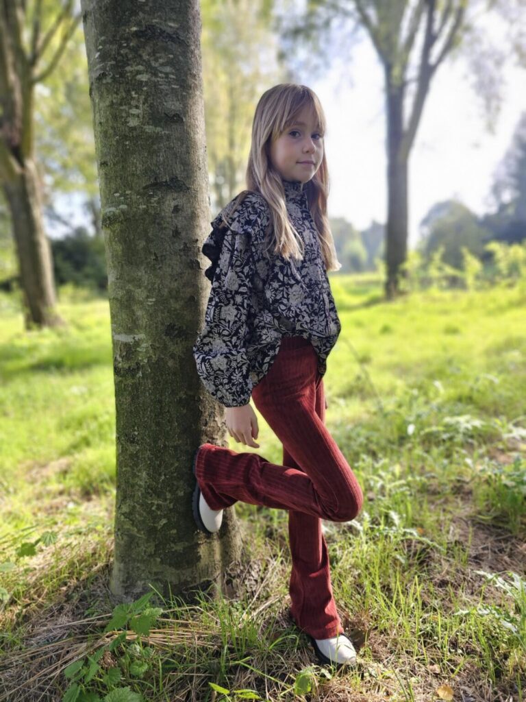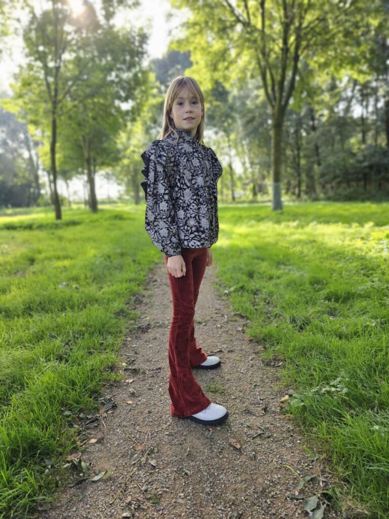 Oh jongens echt die blouse….. die wil ik zelf ook! De kleur, de print, de prachtige afwerking en dan vooral die leuke details erop. Ik hou ervan! Jez is ook helemaal fan en super blij met de set. De blouse ‘BENNE‘ kun je leuk variërend dragen, losjes over de broek of juist leuk een beetje in de broek. Zo creëer je je eigen look.