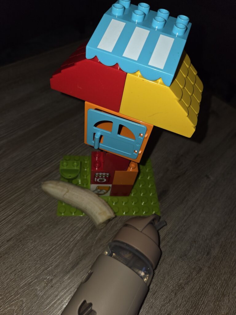En dan is er natuurlijk de peuter… Die vond vooral de vulkaanpagina fantastisch. Zo fantastisch zelfs, dat hij besloot “ik wil dat zelf doen”!! Met Duplo, een drinkbeker en een halve banaan 🤓. Resultaat: een natuurramp op de salontafel.