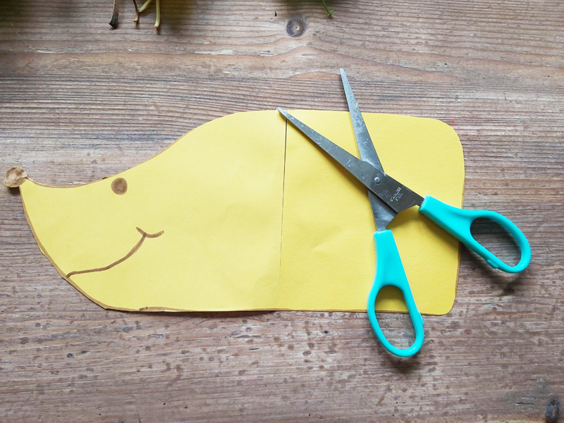 Om te beginnen tekenen we op het vel papier de omtrek van een egeltje, ook tekenen we alvast een mondje en oogje. Let wel op dat het lichaam een beetje groter is zodat je dadelijk de bladeren er goed op kunt plakken. Als je tevreden bent met je omtrek dan mag je deze uitknippen.